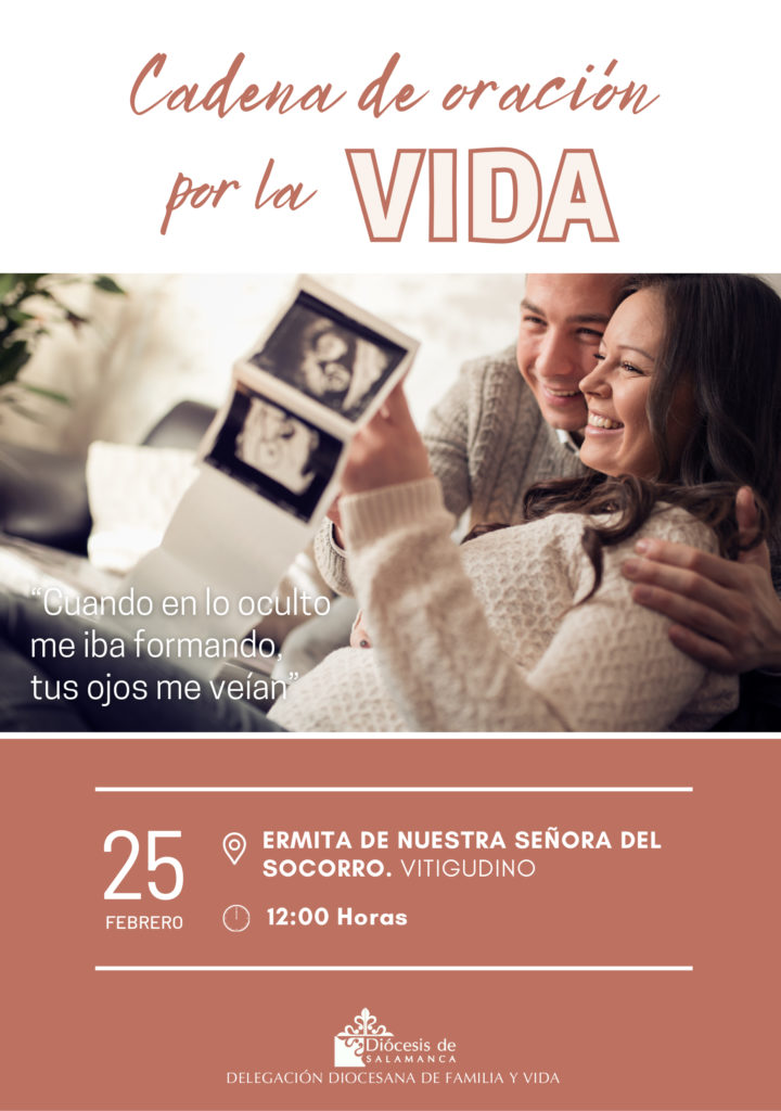El próximo domingo, 25 de febrero, se celebrará la cadena de oración por la vida, promovida por la Delegación diocesana de Familia y Vida que se celebra el día 25 de cada mes. En esta ocasión, tendrá lugar en el Santuario de la Virgen del Perpetuo Socorro en Vitigudino, y se iniciará a las 12:00 horas con el rezo del Ángelus, seguido de la eucaristía y la lectura de un texto relacionado con el versículo 15 del Salmo 138: “Cuando en lo oculto me iba formando, tus ojos me veían”, que invitará a la reflexión.