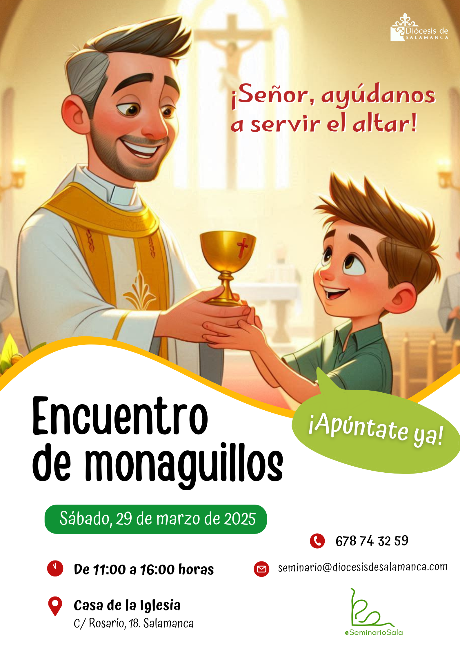 El Seminario diocesano de Salamanca invita a los párrocos y comunidades parroquiales a que animen a los niños y niñas que colaboran habitualmente como monaguillos, ayudando a los sacerdotes en el altar, a participar en la convivencia que tendrá lugar el próximo sábado, 29 de noviembre, de 11:00 a 16:00 horas, en las dependencias del Seminario, en la Casa de la Iglesia.