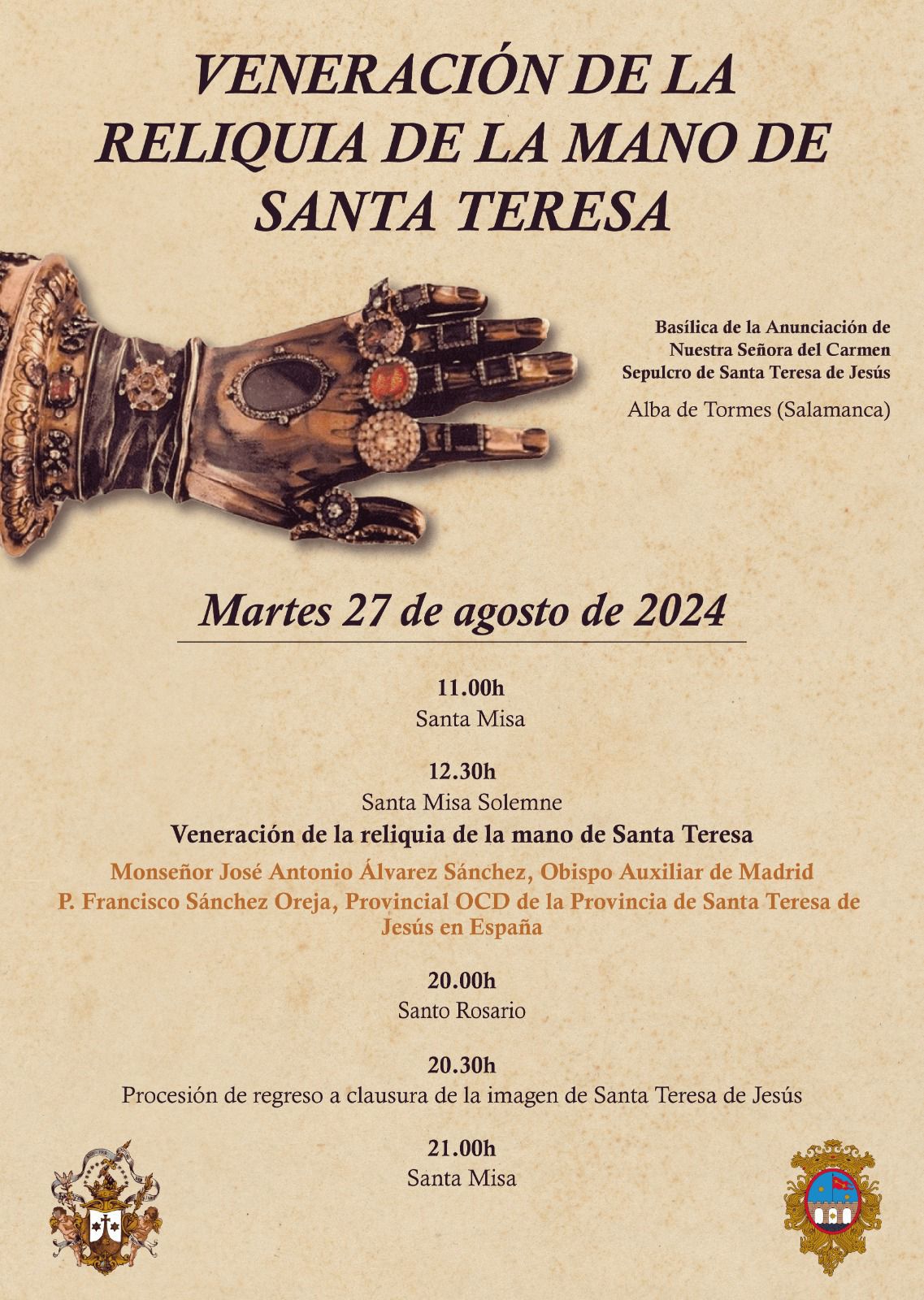 El obispo de Salamanca, Mons. José Luis Retana, fue el encargado de pedir la aprobación de Roma, para el reconocimiento canónico de las reliquias de Santa Teresa de Jesús que se conservan en Alba de Tormes. En concreto, el cuerpo y dos reliquias mayores: el corazón y un brazo. Además, anunciaron que se unirá a este estudio la reliquia de la mano que custodian en Ronda las Carmelitas Descalzas, y que se desplazará hasta Alba de Tormes el 27 de agosto, Fiesta de la Transverberación. Ese día estará en veneración durante la santa misa de las 12:30 horas, que será presidida por el obispo auxiliar de Madrid, Mons. José Antonio Álvarez Sánchez, y el provincial OCD de la Provincia Santa Teresa de Jesús en España, P. Francisco Sánchez Oreja. Esta reliquia salió de Alba en 1585.