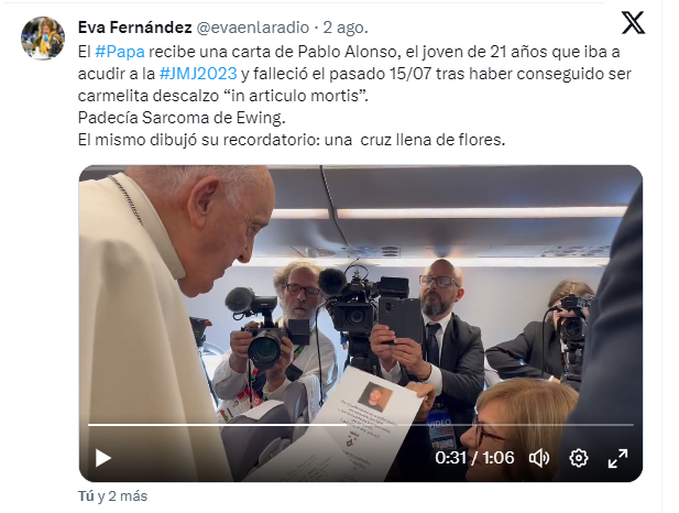 Este miércoles, 2 de agosto, durante el viaje en avión hacia la Jornada Mundial de la Juventud en Lisboa, el papa Francisco recibió un regalo muy especial de la corresponsal de COPE en Italia, Eva Fernández. Se trataba de una carta póstuma escrita por el carmelita salmantino, Fray Pablo María de la Cruz Alonso, quien falleció el pasado 15 de julio, con tan solo 21 años, a causa del sarcoma de Ewing que padecía desde los 16.