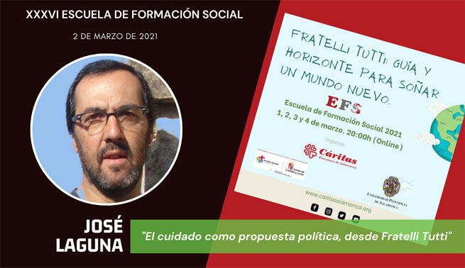 El martes, 2 de marzo, continúa la Escuela de Formación Social (EFS) que organiza Cáritas diocesana de Salamanca y que en esta 36 edición lleva por lema: “Fratelli Tutti: guía para soñar un mundo nuevo”. En esta ocasión, tomará la palabra el teólogo, músico y pedagogo José Laguna Matute, quien hablará sobre “El cuidado como propuesta política, desde Fratelli Tutti”. Ésta será la segunda ponencia prevista en la programación de la EFS de este año, que debido a la pandemia se ha visto obligada ha cambiar su formato y se está celebrando online, del 1 al 4 de marzo, a las 20.00 horas, a través de la plataforma Zoom.