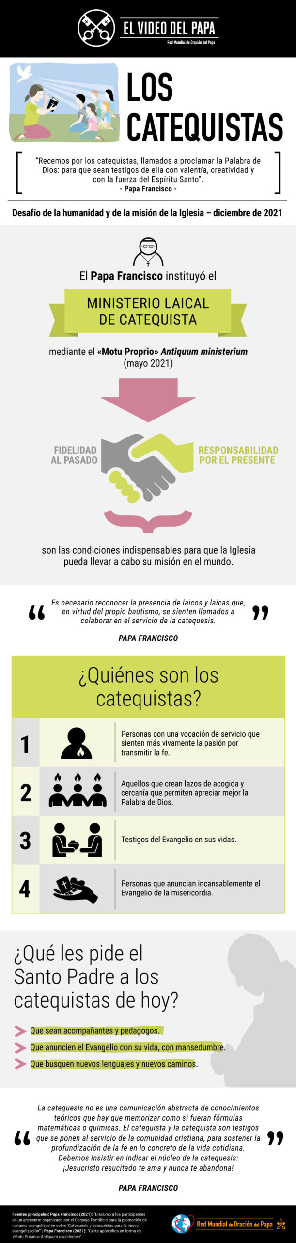 A punto de terminar el 2021, el Santo Padre ratifica esta forma de servicio que se ha mantenido a lo largo de la historia de la Iglesia, en tanto que “el ministerio laical del catequista es una vocación, es una misión”. Todavía hoy, explica en el Video del Papa, se puede ver cómo “en tantas diócesis, en tantos continentes, la evangelización fundamentalmente está en manos de un catequista”, por eso “hace falta buenos catequistas que sean a la vez acompañantes y pedagogos”.