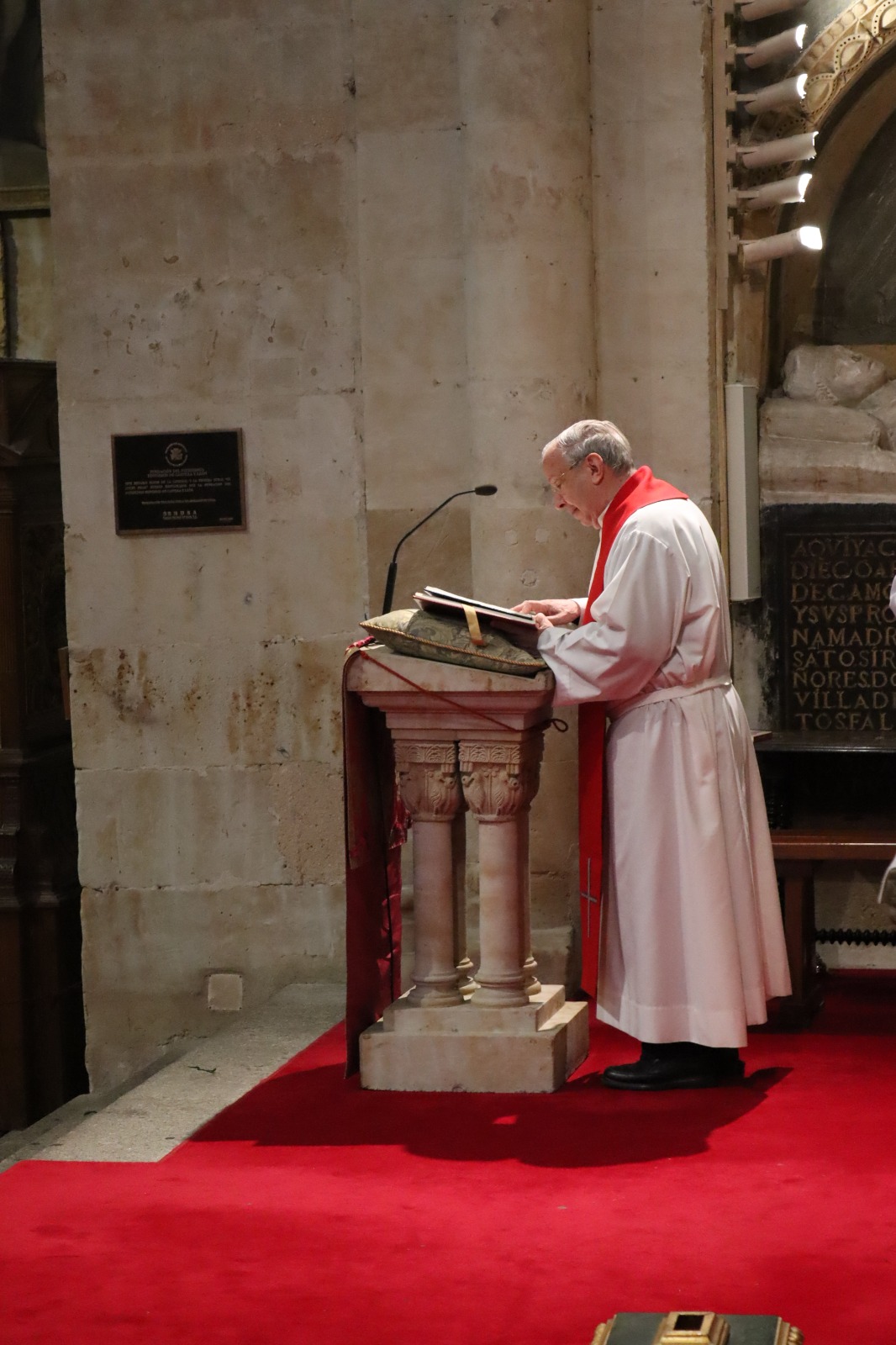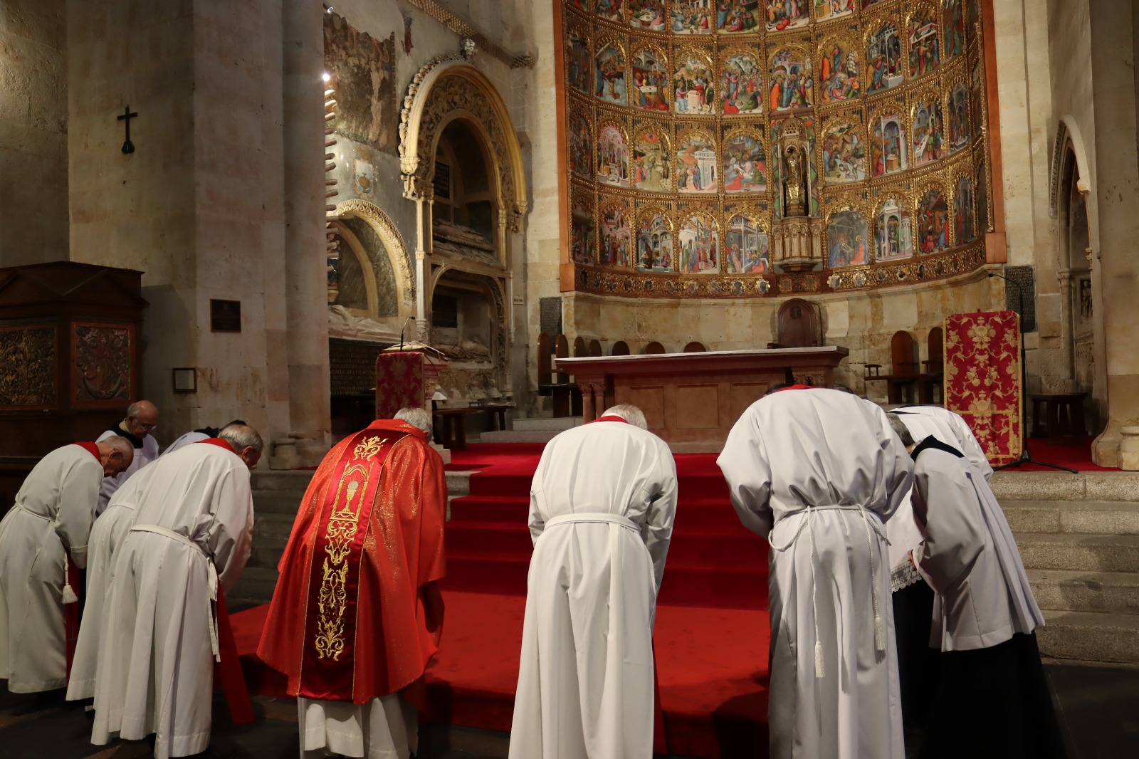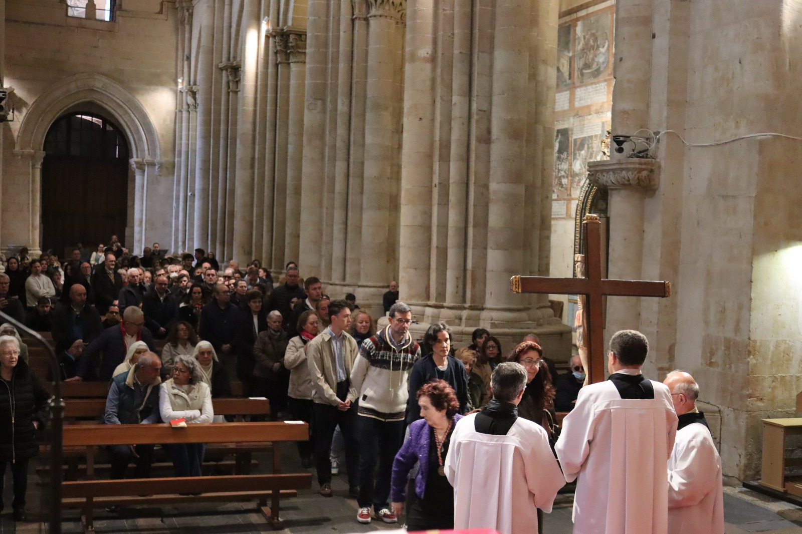 La Catedral Vieja acogió en la tarde del Viernes Santo la celebración de los Santos Oficios, presidida por el obispo diocesano, Mons. José Luis Retana, en una liturgia marcada por la sobriedad y el recogimiento, en la que la Iglesia contempla el misterio de la Cruz, ora por toda la humanidad y expresa su comunión con Tierra Santa a través de la colecta pontificia por los Santos Lugares.
