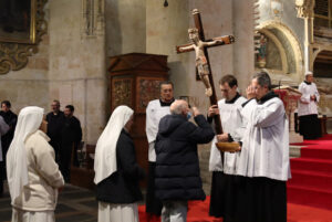 Tras la homilía, se elevó la oración universal, en la que se intercede por la Iglesia y por el mundo entero, expresión del alcance universal de la Pasión de Cristo. A continuación, tuvo lugar la adoración de la Cruz, uno de los momentos más significativos de la celebración, en el que los fieles, en silencio, veneraron el signo de la redención.