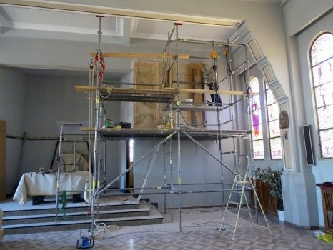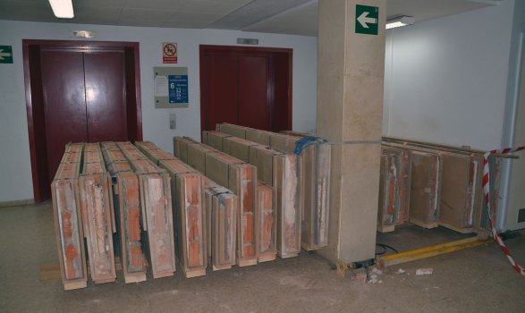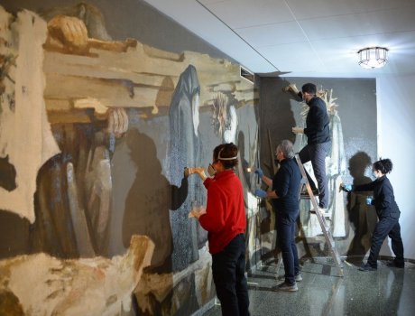 Después se realizaron 21 cortes verticales, “de casi tres metros de altura cada uno y con un peso aproximado a los 300 kilos cada fragmento”, sobre los que se hizo un tratamiento del estrato pictórico con limpieza química y de reintegración cromática. Finalmente, se aplicó una protección en la superficie para preservar la pintura de la luz y del polvo.