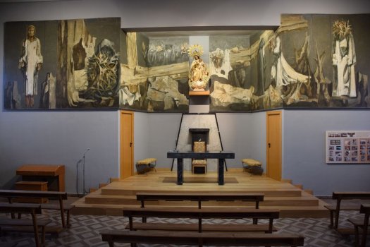 Con unas dimensiones de 15,50*2,69 metros, el Via Crucis se presenta íntegramente en su nueva ubicación, a diferencia de la capilla del Hospital Clínico, donde se desplegaba en tres de sus muros y quedaba interrumpido a la mitad por la puerta de acceso.