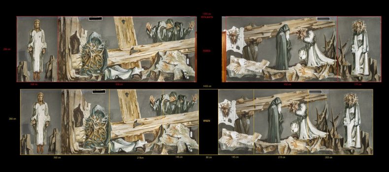 La cruz “empieza siendo madera y acaba siendo un chorro de luz que se va enterrando”, como señalaba el propio pintor, “una cruz larga que representa el peso de la vida, de las circunstancias y de la aceptación”; la Virgen “como un pozo de dolor”, que representa el dolor espiritual; las mujeres que gritan, que “representan el dolor humano, el más físico”, y el Resucitado, “que nos acoge con sus manos, es el descanso en el Padre, y que significa también la esperada curación”, concluye Julieta.