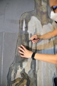 La directora de Uffizzi, María Luisa López, destaca la complejidad de recuperar un mural contemporáneo del siglo XX, “una obra merecedora de ser recuperada por su significación, importancia artística y, sobre todo, por el mensaje que transmite tanto a los enfermos como a todos los ciudadanos que se acercan a la capilla”. El mural pintado por Genaro de No se encontraba en un muro con una terminación industrial, donde el artista plasmó su obra sobre el gotelé, aplicando “mucha más materia pictórica y veladuras”, como resalta Mª Luisa. “Hacer un arranque mediante un tejido no nos daba garantía de recuperar toda la pintura”, por ello apostaron por la técnica de arranque en masa.