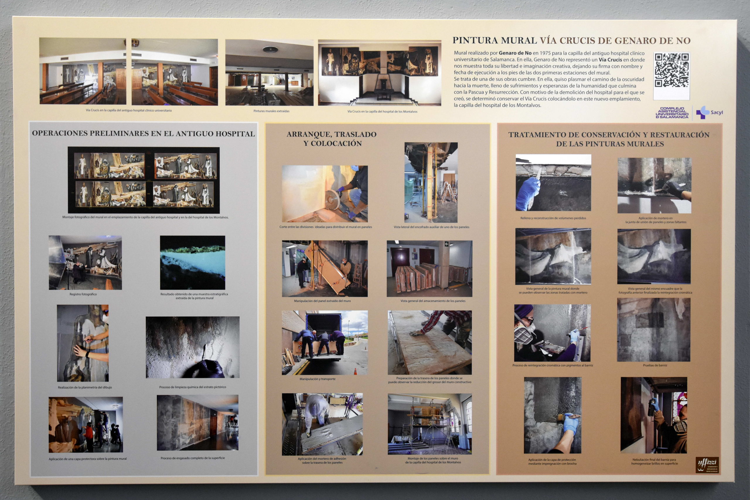 Del 14 de marzo al 22 abril de 2022, la empresa Uffizzi realizó la extracción del mural mediante la técnica de “arranque en masa”, procediendo después a su restauración y emplazamiento en el ábside de la capilla del Hospital de Los Montalvos, donde el mural no pierde el contexto para el que fue concebido, un hospital. “Un lugar donde la humanidad vive el dolor, el sufrimiento y la esperada curación. Una experiencia que viven los sanitarios, los enfermos y sus acompañantes. Para ellos pintó Genaro de No este Vía Crucis que termina en la resurrección, en la esperanza”, recuerda Gil. Para este responsable, el mural de Genaro de No conjuga tres cosas fundamentales para la vida de un cristiano, “el amor de Cristo, la muerte y el misterio del Padre que le resucita”.