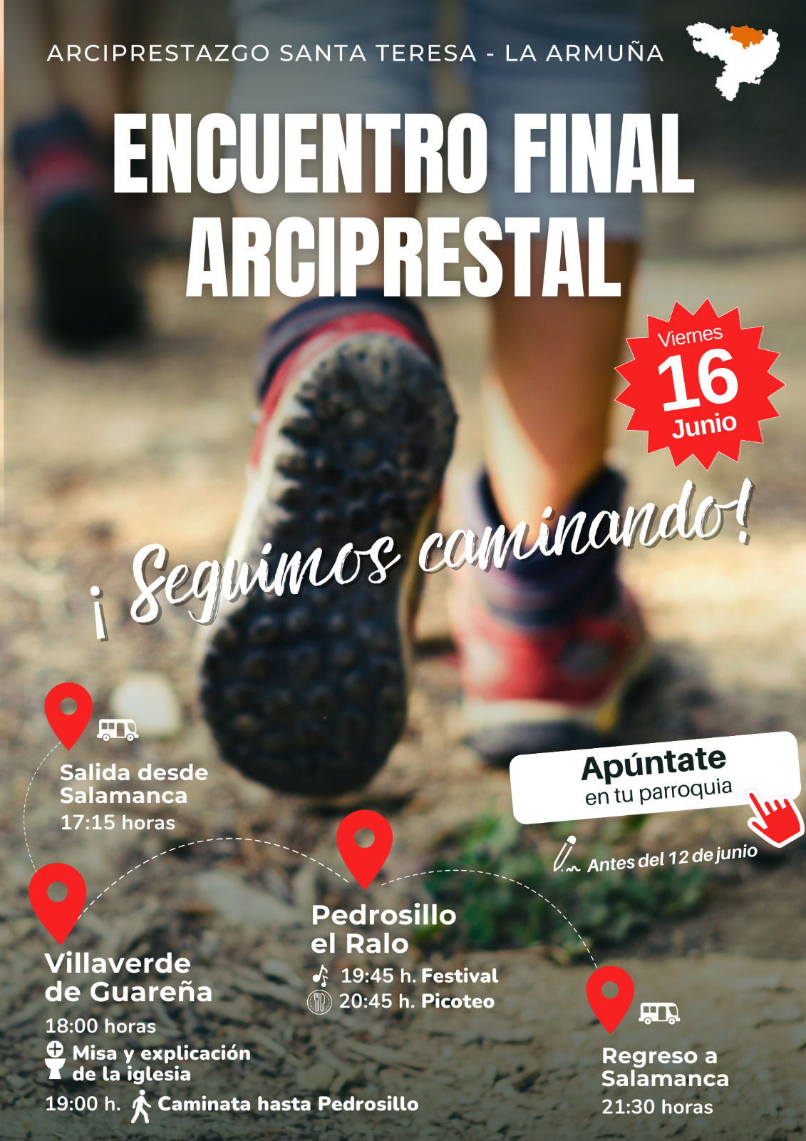 Bajo el lema: “Seguimos caminando”, este viernes, 16 de junio, el arciprestazgo santa Teresa de Jesús-La Armuña celebrará un encuentro de clausura de las actividades de este curso, que congregará a fieles de las 47 parroquias que lo integran.