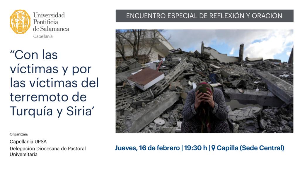 La Capellanía de la Universidad Pontificia de Salamanca (UPSA) junto con la Delegación diocesana de Pastoral Universitaria organizan un encuentro especial de reflexión y oración ‘Con las víctimas y por las víctimas del terremoto de Turquía y Siria’. Una catástrofe natural que tuvo lugar el pasado 6 de febrero y que ha asolado el sudeste de Turquía y el noroeste de Siria, causando más de 35.000 muertos, 85.000 heridos y e innumerables daños materiales.