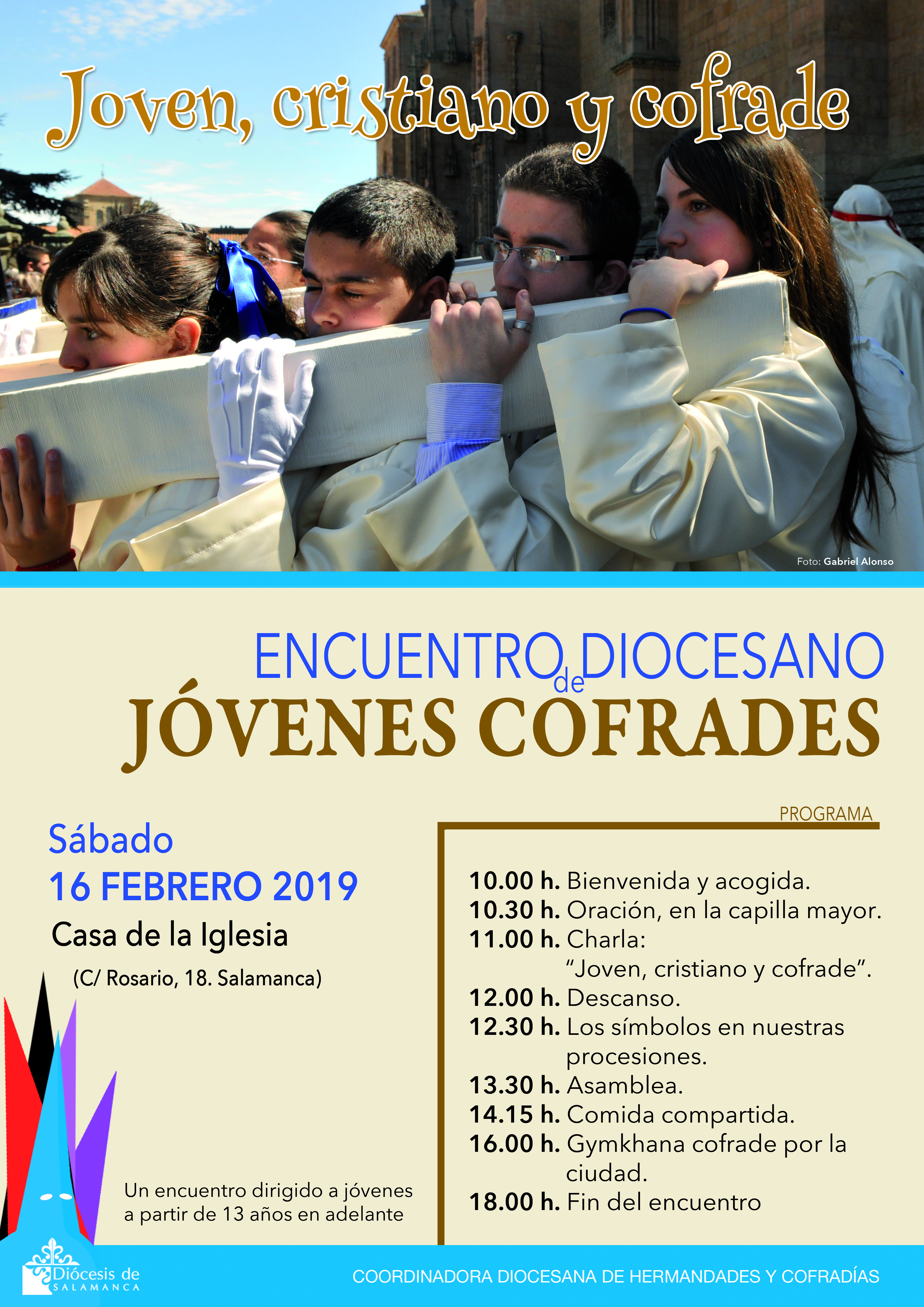 “Joven, cristiano y cofrade”, es el tema que se va abordar en el encuentro diocesano de Jóvenes Cofrades organizado por la Coordinadora diocesana de Hermandades y Cofradías que se va a celebrar el sábado 16 de febrero, de 10.00 a 18.00 horas en la Casa de la Iglesia (C/ Rosario, 18. Salamanca). Una jornada de convivencia que tiene como objetivo que los jóvenes cofrades de la Diócesis de Salamanca se reencuentren, se conozcan, dialoguen, compartan y oren juntos.