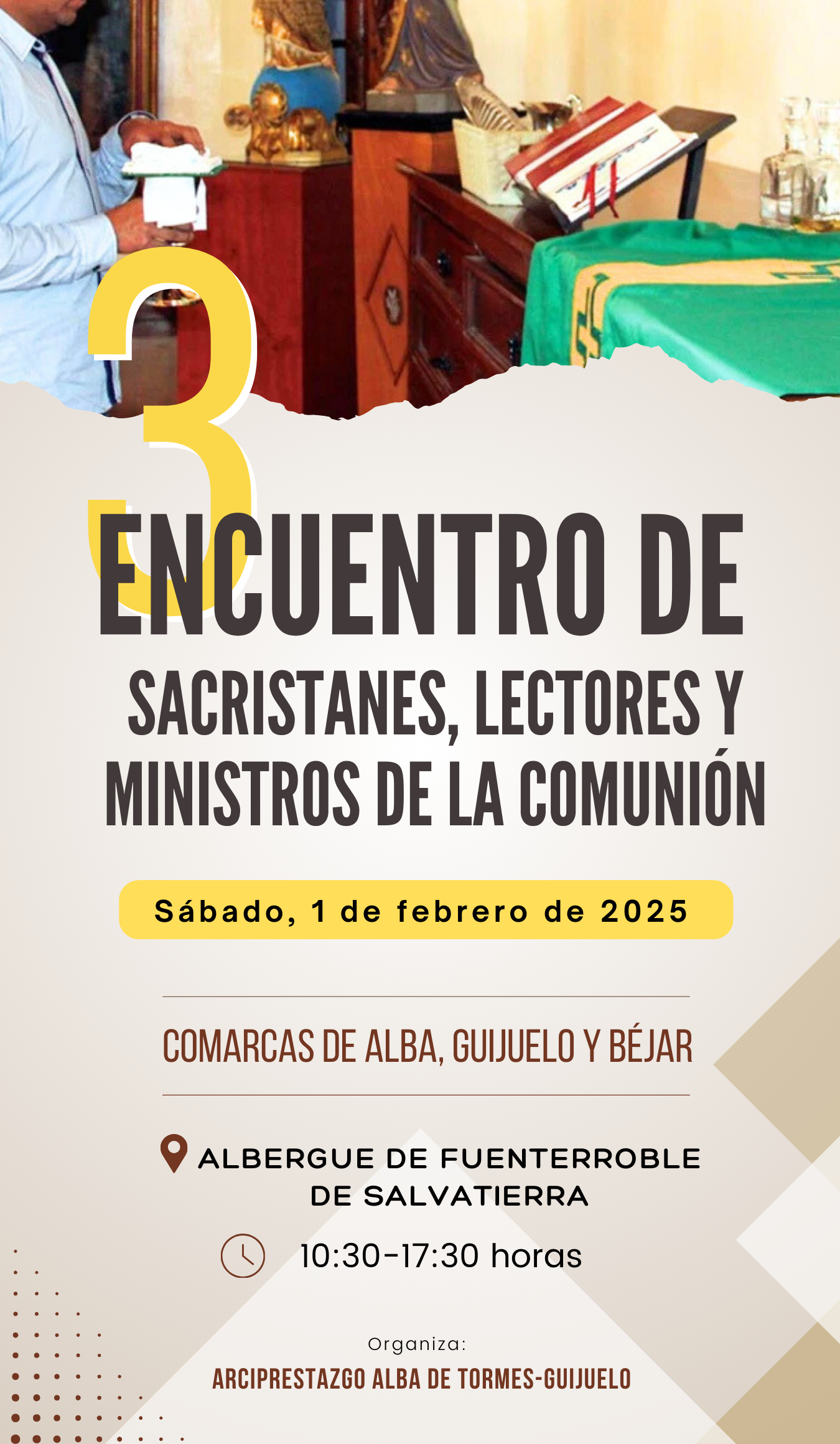 El próximo sábado, 1 de febrero, se celebrará en el Albergue de Fuenterroble de Salvatierra un encuentro formativo y de convivencia dirigido a sacristanes, lectores y ministros de la comunión que colaboran habitualmente en las parroquias del Arciprestazgo “Santa Teresa”, en Alba de Tormes y Guijuelo, así como aquellos interesados en ofrecer este servicio. La jornada tendrá lugar de 10:30 a 17:30 horas y contará con diversas actividades.