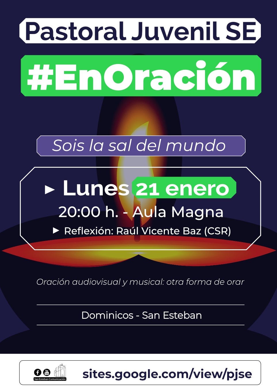Pastoral Juvenil San Esteban organiza un nuevo encuentro #EnOración. Tendrá lugar el lunes 21 de enero, a las 20.00 horas en el Aula Magna del Convento de los Dominicos. En esta ocasión la oración audiovisual y musical estará inspirada en el tema de Luis Guitarra: “Sois la sal”, y la meditación girará sobre cómo dar testimonio de vida cristiana en el mundo de hoy. La reflexión correrá a cargo esta vez de Raúl Vicente Vaz, hermano mayor de la Archicofradía del Rosario. Se trata de un acto abierto a todos y pensado especialmente para jóvenes, como indican desde la organización.