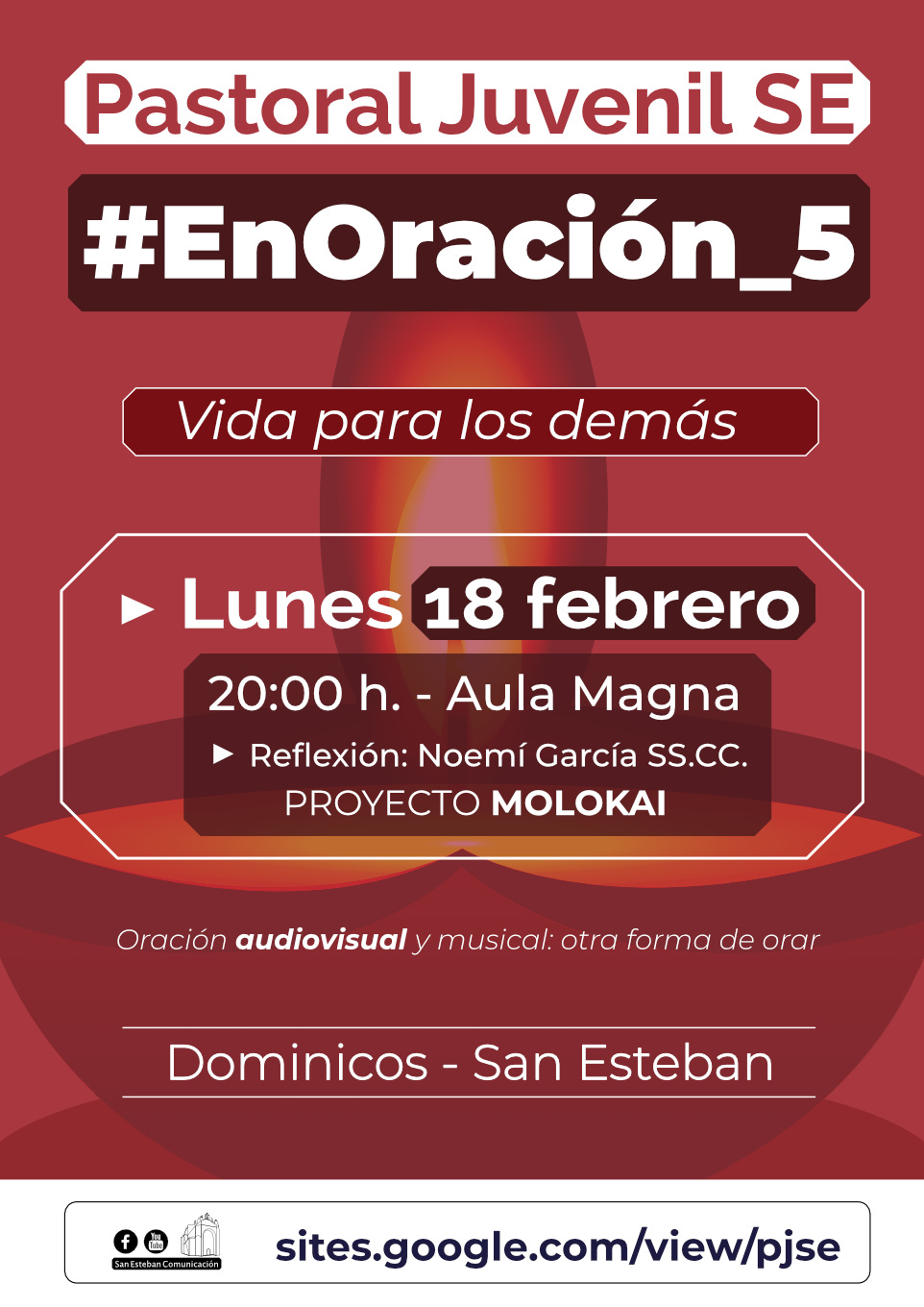 El lunes, 18 de febrero, tendrá lugar el quinto encuentro #EnOración que organiza la Pastoral Juvenil San Esteban. Bajo el lema: “Vida para los demás”, en esta ocasión la oración-reflexión llegará de la mano de Noemí García, religiosa de los Sagrados Corazones, coordinadora del proyecto de voluntariado juvenil MOLOKAI. Una oración hecha compasión, en favor de los más desfavorecidos, con música de Maite López. “El amor” hecho vida, testimonio y cercanía.