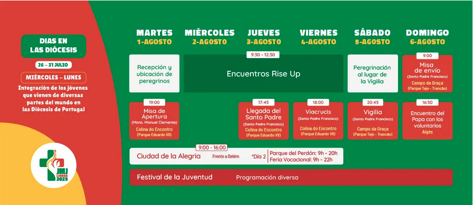 Las actividades de la JMJ arrancarán el martes, 1 de agosto, con la Misa de apertura que va a presidir el cardenal patriarca de Lisboa, Mons. Manuel Clemente, a las 19:00 horas, en la Colina do Encontro, a la que asistirán los jóvenes salmantinos que esperan con mucha ilusión disfrutar en estos días de esta experiencia de Iglesia que marcará un antes y un después en la vida de cada uno de ellos.
