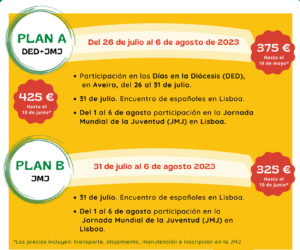 La Diócesis de Salamanca participará en la Jornada Mundial de la Juventud (JMJ) que se celebra este verano en Lisboa. Los jóvenes pueden inscribirse en dos plazos diferentes, en los que varía el precio. El primero de ellos finaliza este miércoles, 10 de mayo, y el coste para vivir las dos experiencias que se proponen es de 375 euros, que se incrementa a 425, en el caso de inscribirse en el segundo plazo, que se extiende del 11 de mayo al 10 de junio. También existe la posibilidad de acudir tan solo a la JMJ, del 1 al 6 de agosto, a un precio único de 325 euros.