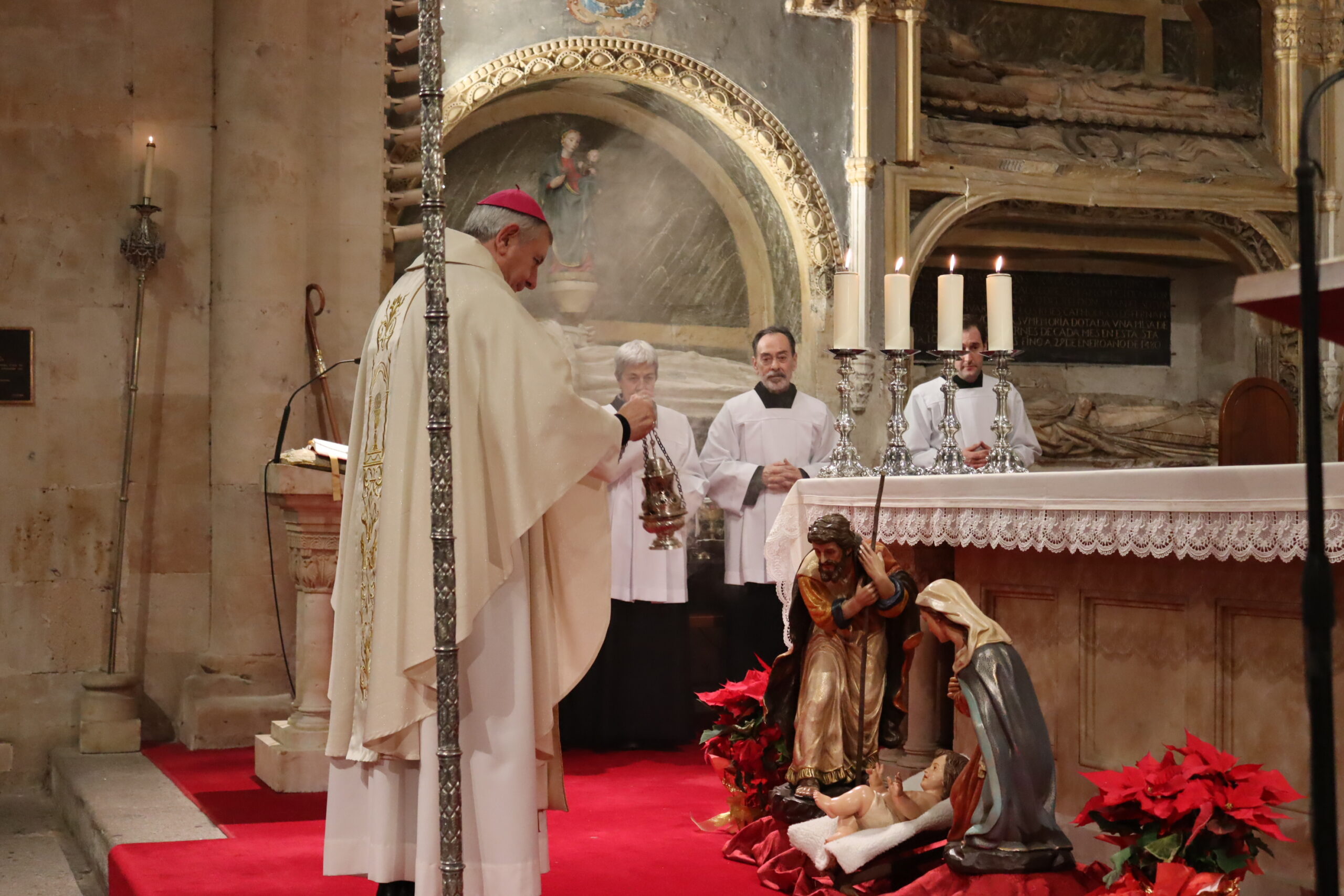 Una celebración que fue presidida por el obispo de Salamanca, Mons. José Luis Retana, y concelebrada por el deán y varios canónigos del Cabildo Catedral. En su homilía, invitó a contemplar esa noche santa como el descubrimiento de un Dios que ha querido decirnos personalmente cuánto nos ama, animando a acompañar a al Sagrada Familia “en este instante trascendente de la historia en el que el mundo no tuvo lugar para ellos en la posada” y a proclamar “bien alto que nosotros queremos dejarles entrar en nuestro corazón y en nuestra vida para que la llenen de luz y la hagan más humana y más divina” y que favorezca una mayor fraternidad en el mundo.