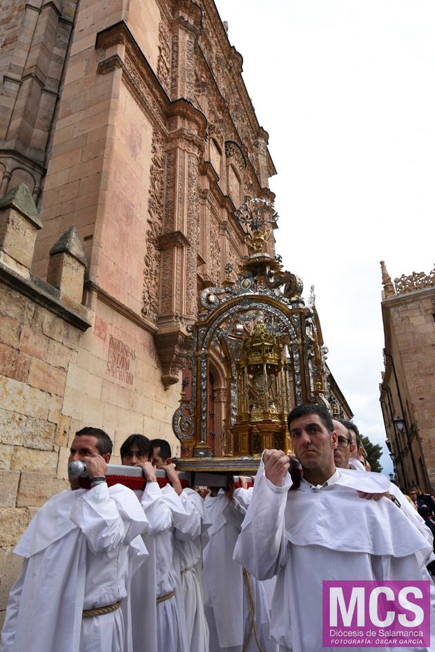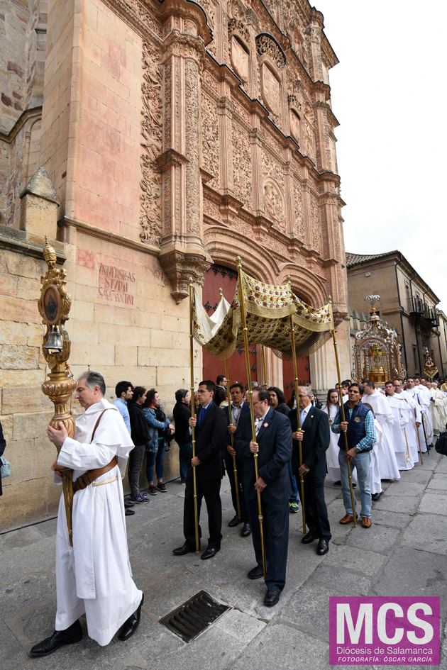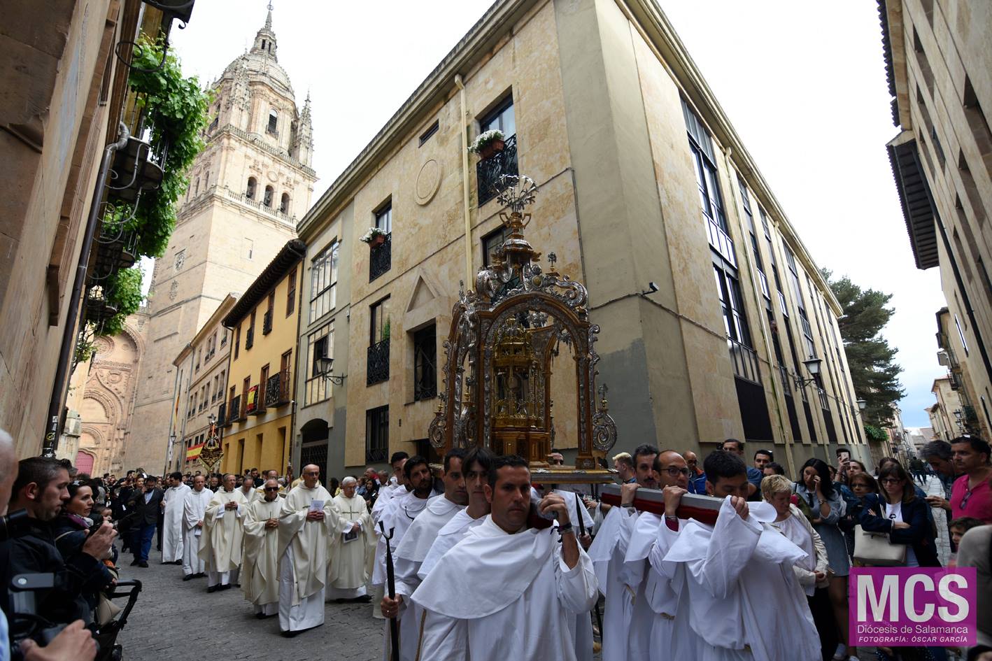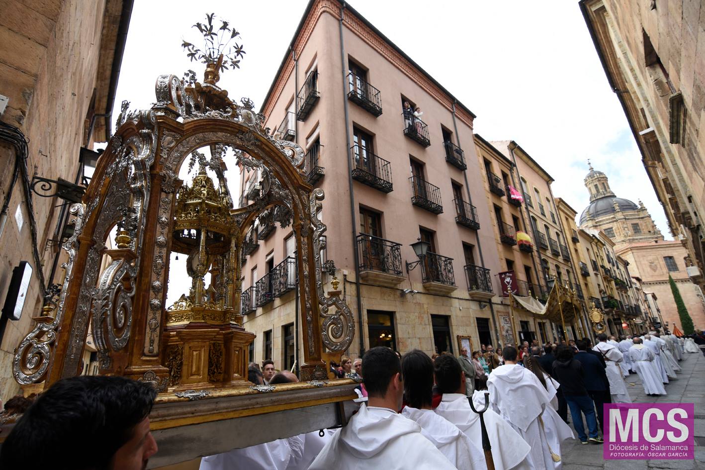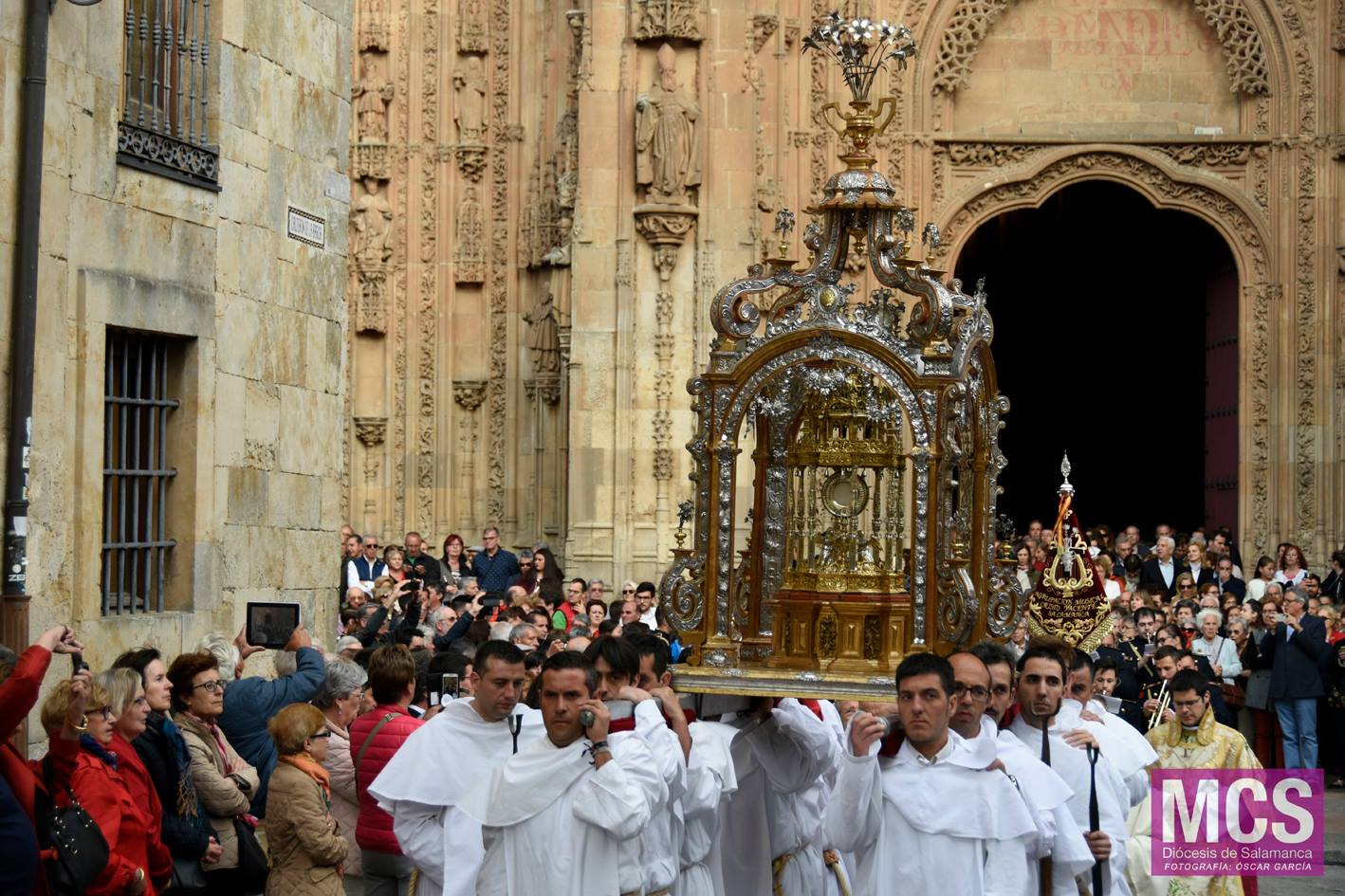 Al término de la eucaristía se celebró la procesión del Santísimo por las calles del casco histórico de Salamanca, que culminó en el atrio de la Catedral con la bendición solemne. Para la ocasión se instalaron dos altares, uno de ellos junto a la puerta de la iglesia de San Sebastián con las imágenes de La Purísima, Santo Tomás de Aquino, Santa Teresa de Jesús y San Pedro Nolasco, para recordar el IV Centenario del voto inmaculista de Salamanca, el VIII Centenario de la Universidad de Salamanca, el Año Jubilar Teresiano así como el VIII Centenario de la Orden Mercedaria. El segundo altar se ubicó junto a la Puerta de Ramos de la Catedral Nueva donde se encontraba la imagen de Nuestro Padre Jesús de la Redención, de la Archicofradia del Rosario, que plasma el momento de la institución de la Eucaristía, obra de José Antonio Navarro Arteaga.