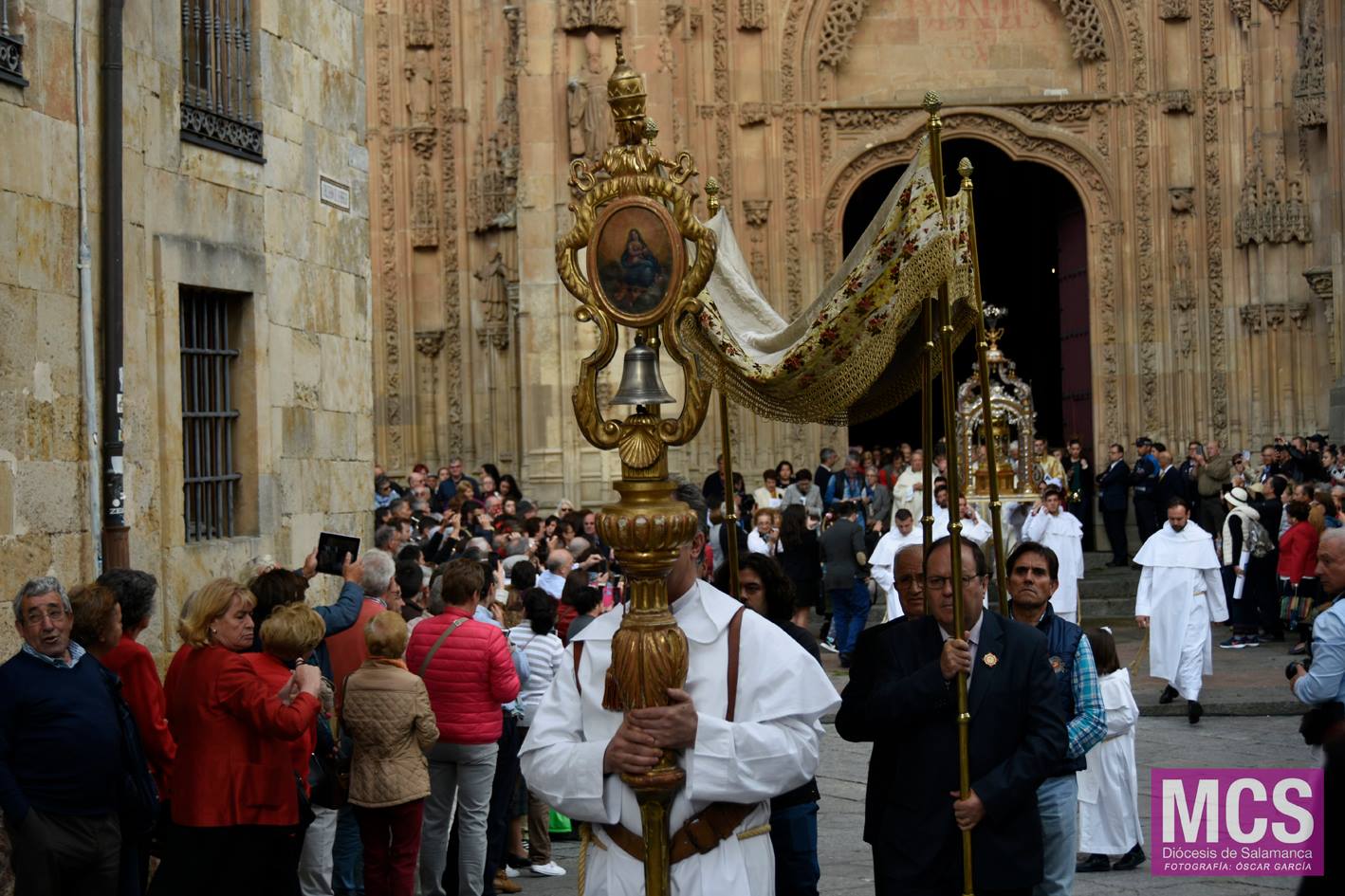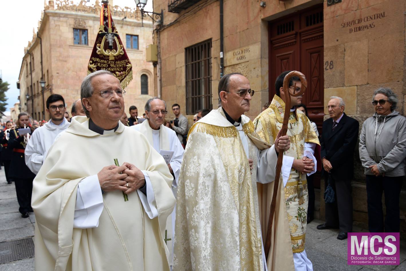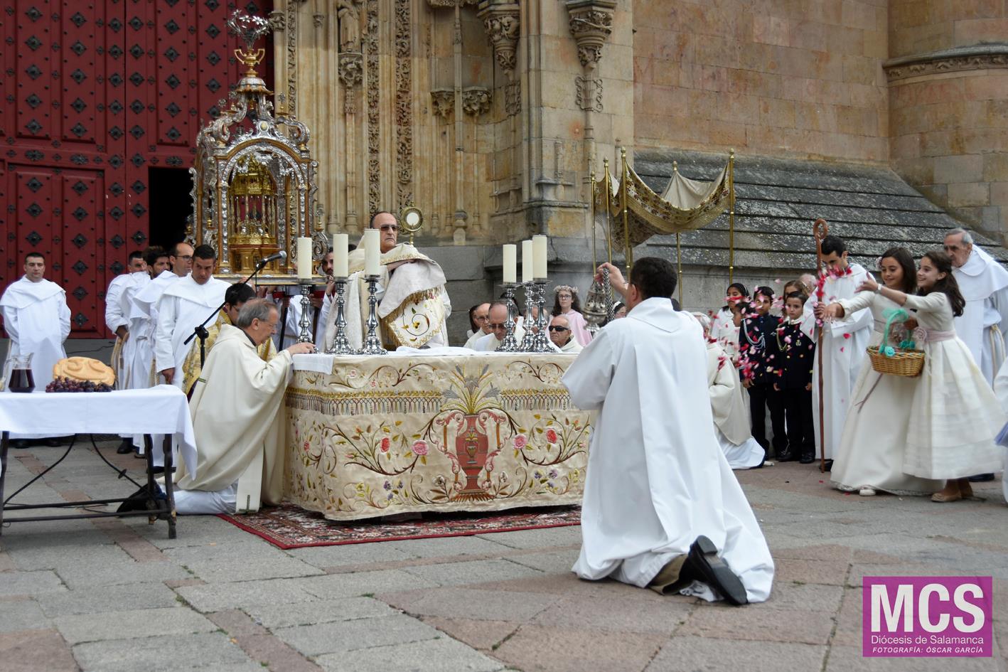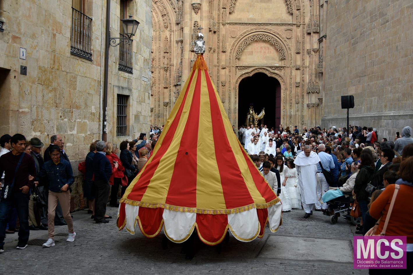 Al término de la eucaristía se celebró la procesión del Santísimo por las calles del casco histórico de Salamanca, que culminó en el atrio de la Catedral con la bendición solemne. Para la ocasión se instalaron dos altares, uno de ellos junto a la puerta de la iglesia de San Sebastián con las imágenes de La Purísima, Santo Tomás de Aquino, Santa Teresa de Jesús y San Pedro Nolasco, para recordar el IV Centenario del voto inmaculista de Salamanca, el VIII Centenario de la Universidad de Salamanca, el Año Jubilar Teresiano así como el VIII Centenario de la Orden Mercedaria. El segundo altar se ubicó junto a la Puerta de Ramos de la Catedral Nueva donde se encontraba la imagen de Nuestro Padre Jesús de la Redención, de la Archicofradia del Rosario, que plasma el momento de la institución de la Eucaristía, obra de José Antonio Navarro Arteaga.