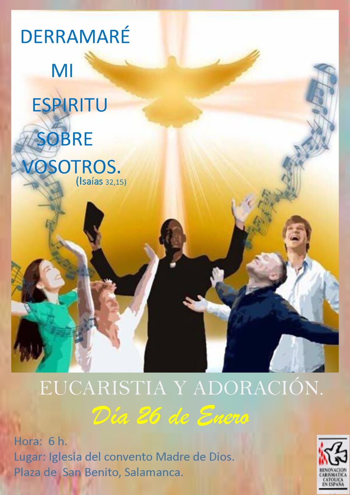 El movimiento Renovación Carismática Católica de Salamanca celebrará el próximo 26 de enero su encuentro mensual de Eucaristía y Adoración, al que nos invita a participar. Como es habitual, se iniciará a las 18.00 horas en la iglesia del convento Madre de Dios, en la Plaza de San Benito de Salamanca.