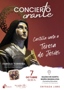Finalmente, el sábado día 7, la cantautora teresiana Fabiola Torrero ofrecerá un concierto-orante titulado: “Castilla canta a Teresa”, a las 18:30 horas, en la iglesia de Santa María Magdalena, de los Carmelitas descalzos de Salamanca, en la calle Zamora. La entrada es libre hasta completar aforo.