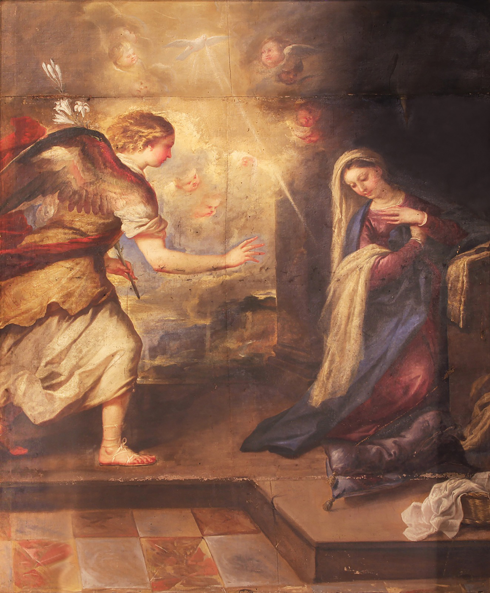 El espacio se distribuye desde este brazo y mano de Gabriel. En la división en horizontal contemplamos, en la mitad superior, el mundo celeste de Dios, lleno de luz y sin espacio; y, en la mitad inferior, el mundo terrenal y temporal de la humanidad, en el que existen las sombras del pecado y el suelo con la perspectiva espacial del enlosado. En la división en vertical los protagonistas tienen su lugar: Gabriel y el Espíritu Santo, a la izquierda; María, a la derecha. La mano de Gabriel entra cuidadosamente en el espacio humano de María iniciando la conversación: “Alégrate, llena de gracia, el Señor está contigo” (Lc 1, 28). La escena concluye con la respuesta de la Virgen, que acepta la propuesta de Dios de ser la Madre de su Hijo, dos gestos expresan en imágenes lo que narra el Evangelio: inclina y vuelve su cabeza a Gabriel, y se presenta arrodillada ante la Palabra de Dios, con las manos puestas sobre su corazón: “Aquí está la esclava del Señor, hágase en mí según tu Palabra” (Lc 1, 38). La gracia del Espíritu Santo hace posible la encarnación del Hijo de Dios: “El Espíritu Santo vendrá sobre ti, y la fuerza del Altísimo te cubrirá con su sombra; por eso el Santo que va a nacer será llamado Hijo de Dios” (Lc 1, 35). En el interior de una gloria celestial, rodeada por querubines, el Espíritu tiene la forma de una paloma desde la que sale un rayo de luz dirigido al vientre de María, fecundando sus entrañas. Sin embargo, la presencia del Espíritu también aparece representada como el aliento o el viento, moviendo y agitando el pelo y la ropa de Miguel y soplando en vertical sobre la Virgen María, cuyas vestimentas caen hacia abajo. Para terminar, nos fijamos en el huerto cerrado que se divisa al fondo y la azucena, portada por la mano izquierda de Gabriel, simbolizan el don de la virginidad y la pureza en la que sigue permaneciendo María después de la concepción de Cristo.