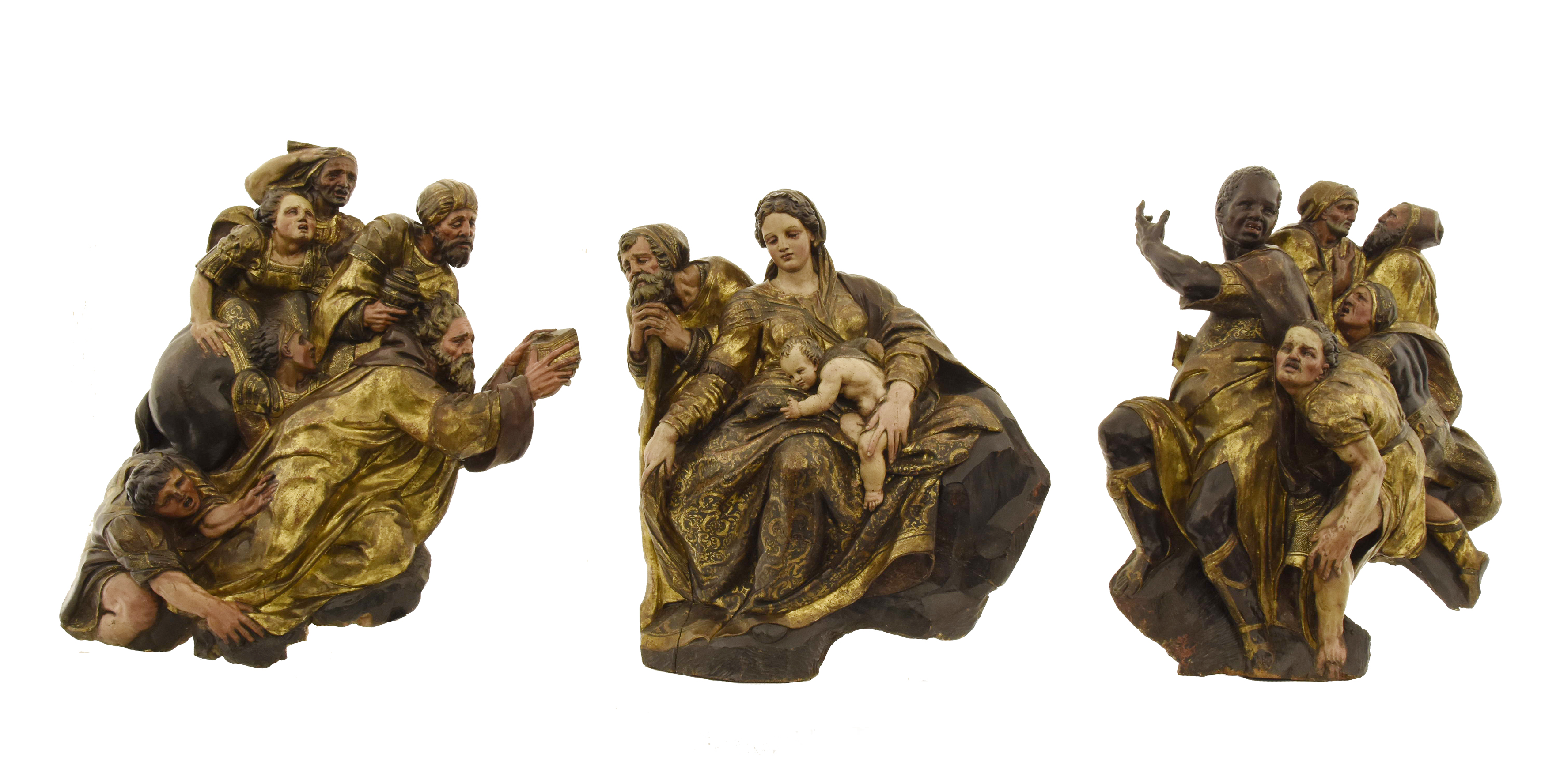 A los lados aparecen los Magos y su séquito, como figuras inestables, alborotadas y en movimiento continuo. A pesar de tanta agitación, el maestro Berruguete consigue, gracias a sus conocimientos compositivos, un grupo unificado a cada lado. Al presentar a los Magos con tanta pasión y dinamismo, le ha dado más importancia a su camino de búsqueda que al momento de sosiego propio de la adoración. Se trata de una obra que refleja el momento de búsqueda que vive la humanidad en el siglo XVI, ante un cambio de época, similar a nuestro tiempo. Siguiendo la iconografía tradicional, los tres Magos simbolizan todas las edades y todos los pueblos de la tierra, es decir, la humanidad entera. Jesús ha nacido para salvar a todos y se deja ver por todo aquel que le busca de verdad. Los Magos han encontrado al Mesías, aún así no hallan descanso, porque Él les ofrece el camino nuevo del Evangelio para volver a su tierra: “se retiraron a su tierra por otro camino” (Mt. 2, 12).