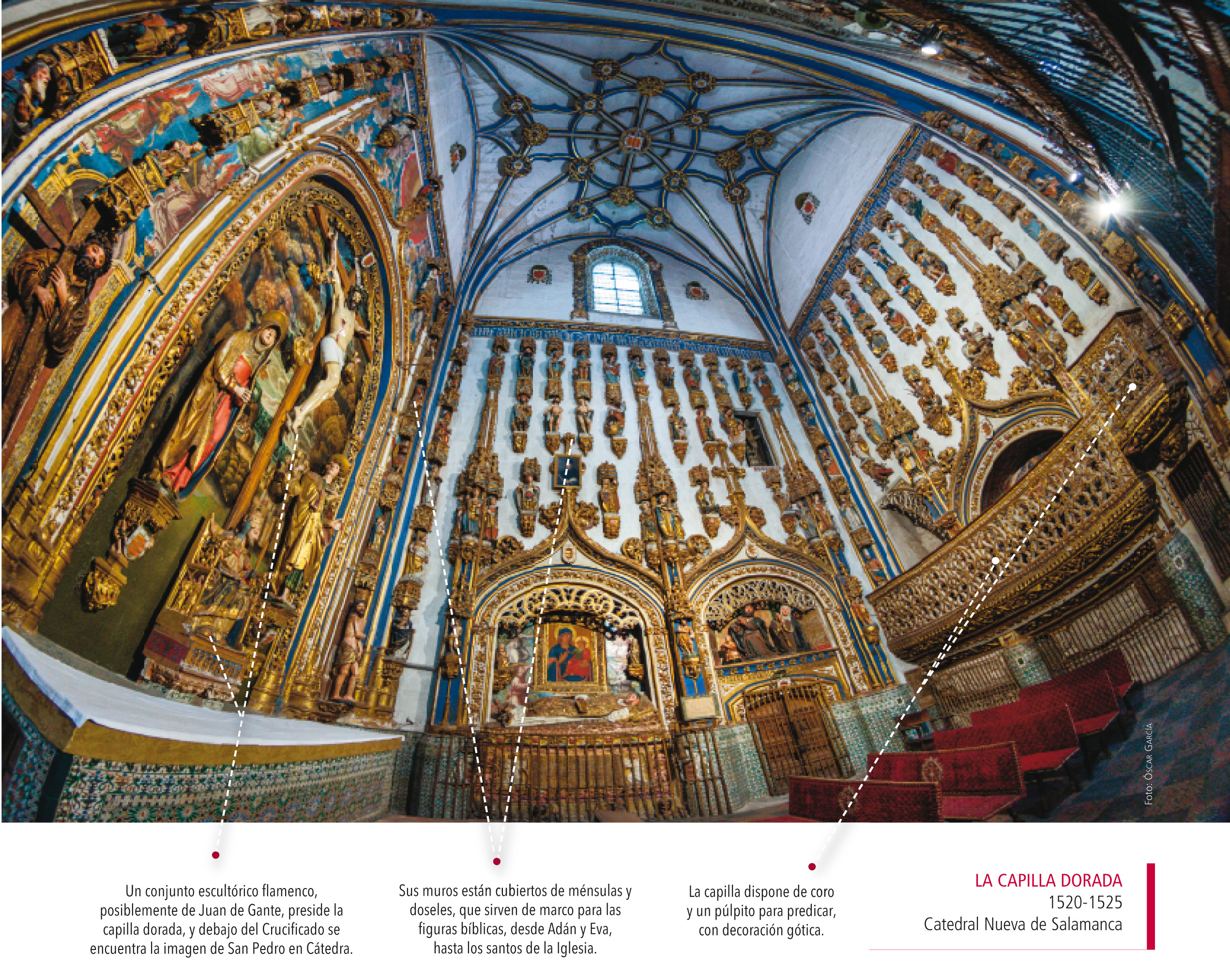 El próximo 1 de noviembre celebraremos la solemnidad de Todos los Santos, por este motivo, nos vamos a acercar a la Capilla Dorada de la Catedral Nueva de Salamanca, que se encuentra situada a los pies, también denominada de Todos los Santos, por su ingente decoración escultórica de santos. Se trata de una de las primeras capillas construidas nada más empezada la seo en 1513. En 1520, el cabildo contrata a Juan de Álava edificar las tres capillas del lado de la epístola, junto a la Catedral Vieja, entre ellas nuestra Capilla Dorada. La capilla fue concluida en su arquitectura en 1523, como consta en una inscripción en la puerta que se realizó para comunicarse con la Catedral Vieja. En 1524, don Francisco Sánchez de Palenzuela, arcediano de Alba, compra al cabildo para su enterramiento esta capilla, el precio se estable en 200.000 maravedíes, los cuales servirán, según está recogido en el archivo catedralicio, para “obra y progreso de la Catedral Nueva” y para “dar ánimo a otros que, imitando a él, hiziesen lo semejante”.