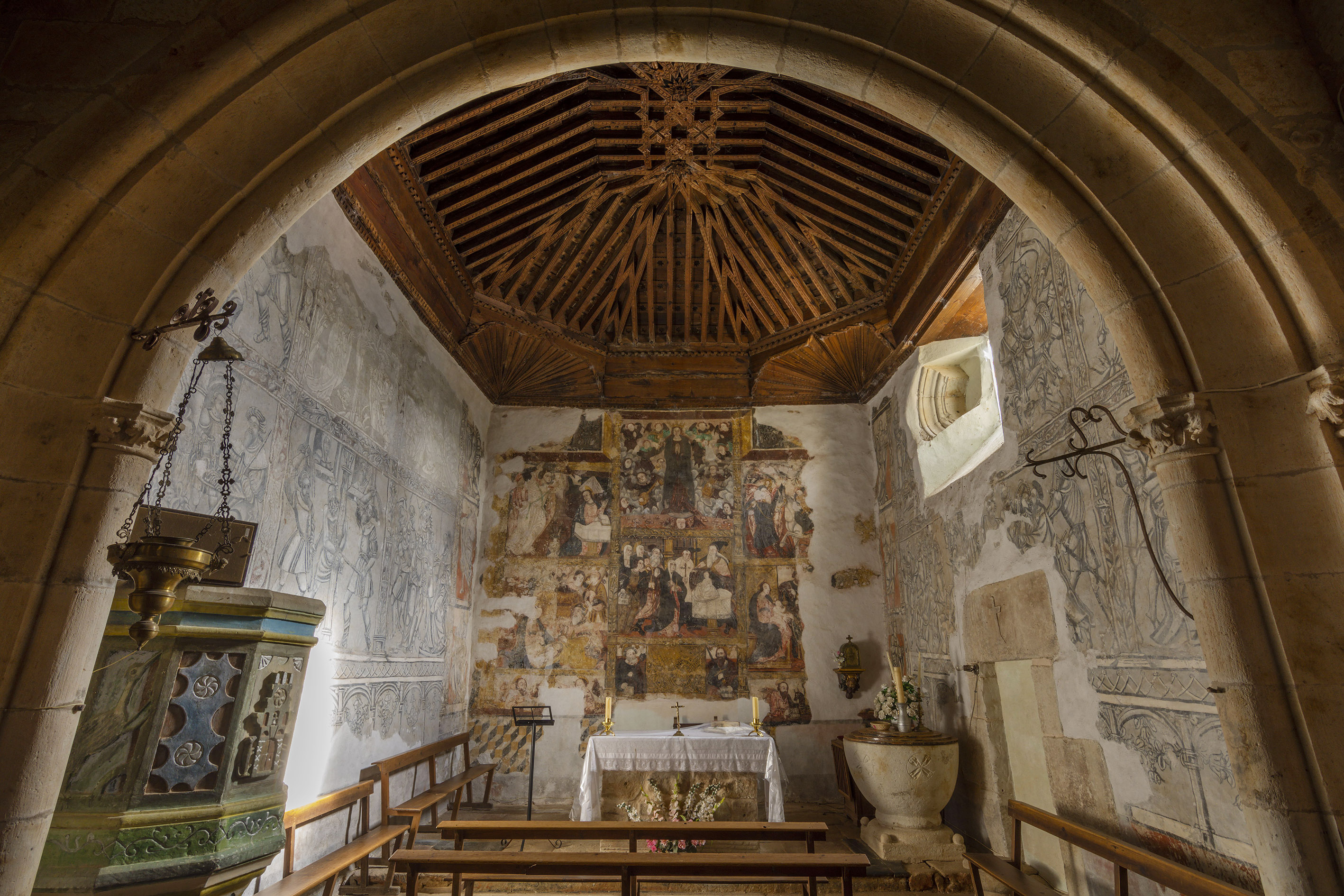 La riqueza decorativa y cromática nos indica que nos encontramos en el lugar más importante del templo, donde se celebra el sacramento de la Eucaristía. Aquí vamos a comer y adorar su Cuerpo, por eso, en el retablo mayor están dispuestas en sus cuerpos y calles, además de la escena de la Presentación de Jesús en el Templo, otras cinco que relatan la encarnación del Hijo de Dios: la Anunciación, el Nacimiento y Adoración de los pastores, la Epifanía y la Huida a Egipto. El retablo es coronado en la calle central, encima de la Presentación, con la Asunción y Coronación de la Virgen. Todo el conjunto del retablo se completa con las pinturas de los muros laterales, en las que fueron pintadas escenas de distintos momentos de la Pasión de Cristo, porque la Eucaristía es renovación y actualización de la entrega única del Señor en el camino hacia cruz y la resurrección.