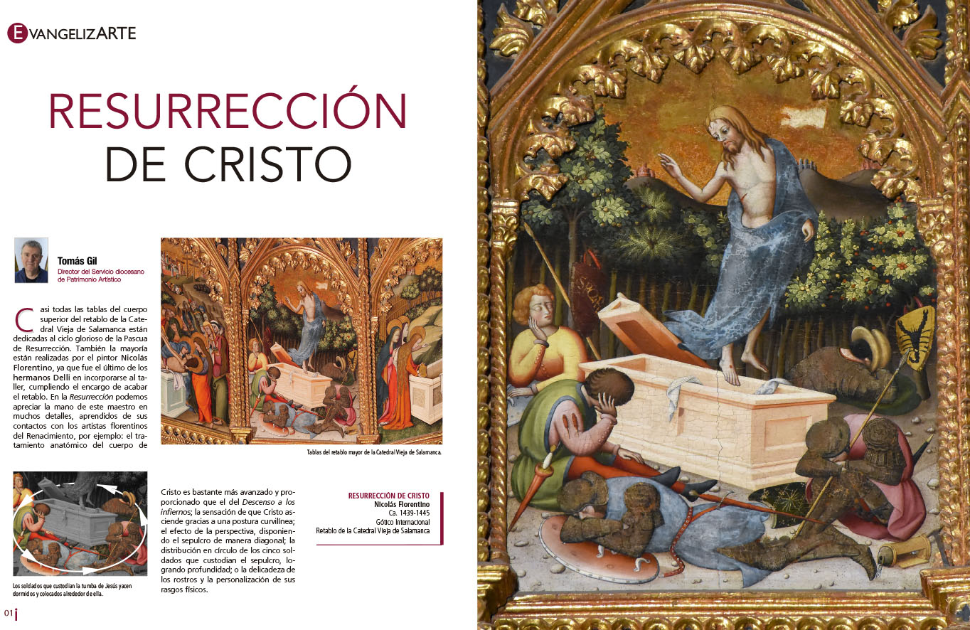 Casi todas las tablas del cuerpo superior del retablo de la Catedral Vieja de Salamanca están dedicadas al ciclo glorioso de la Pascua de Resurrección. También la mayoría están realizadas por el pintor Nicolás Florentino, ya que fue el último de los hermanos Delli en incorporarse al taller, cumpliendo el encargo de acabar el retablo. En la Resurrección podemos apreciar la mano de este maestro en muchos detalles, aprendidos de sus contactos con los artistas florentinos del Renacimiento, por ejemplo: el tratamiento anatómico del cuerpo de Cristo es bastante más avanzado y proporcionado que el del Descenso a los infiernos; la sensación de que Cristo asciende gracias a una postura curvilínea; el efecto de la perspectiva, disponiendo el sepulcro de manera diagonal; la distribución en círculo de los cinco soldados que custodian el sepulcro, logrando profundidad; o la delicadeza de los rostros y la personalización de sus rasgos físicos.
