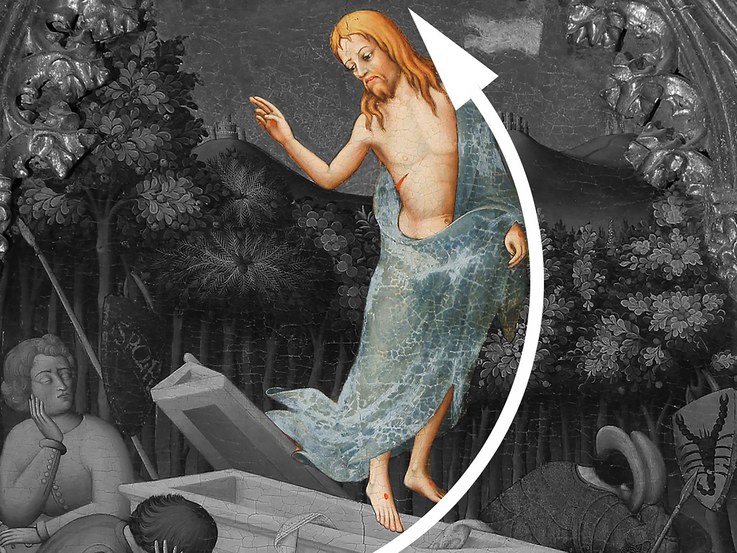 Ahora, después de su pasión y muerte en la cruz, vemos a Jesús elevado por Dios Padre a la vida eterna y, vestido solemnemente como el Señor, se muestra victorioso frente a la muerte (sepulcro) y su causa: el pecado de la humanidad (los guardias).