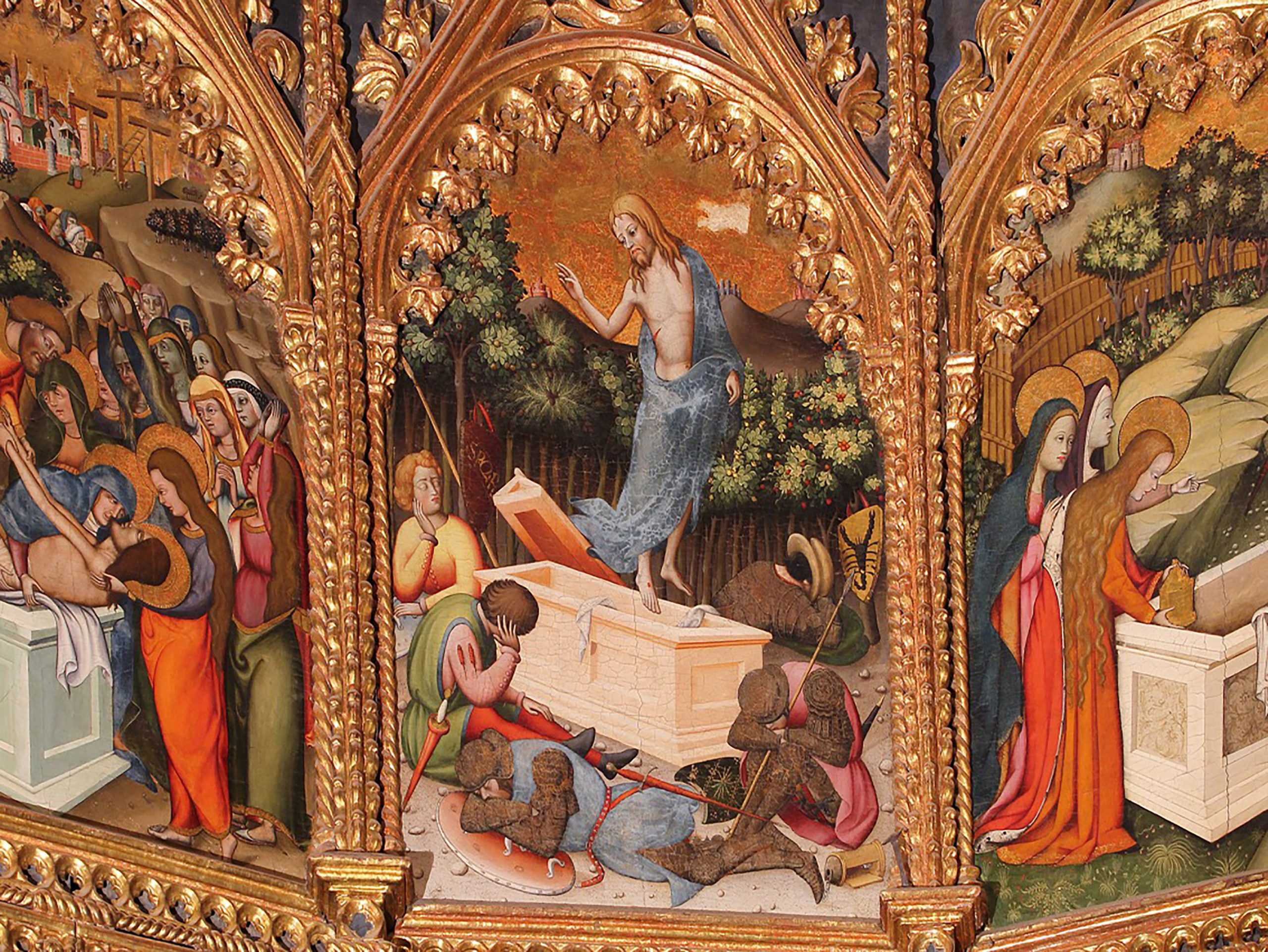 Nicolás Florentino ha separado la escena de la Resurrección de la visita de las mujeres al sepulcro, episodio que aparece en la tabla siguiente. Quiere decir, que lo que pretende es representar el instante mismo en el que Jesús pasa de la muerte a la vida. Al ser un hecho que no está en los evangelios, los artistas acuden al texto del evangelista Mateo, donde se nos cuenta indirectamente, por sus efectos, que en ese momento se abrió el sepulcro y los guardias quedaron como muertos (cf. Mt 28, 2-4).