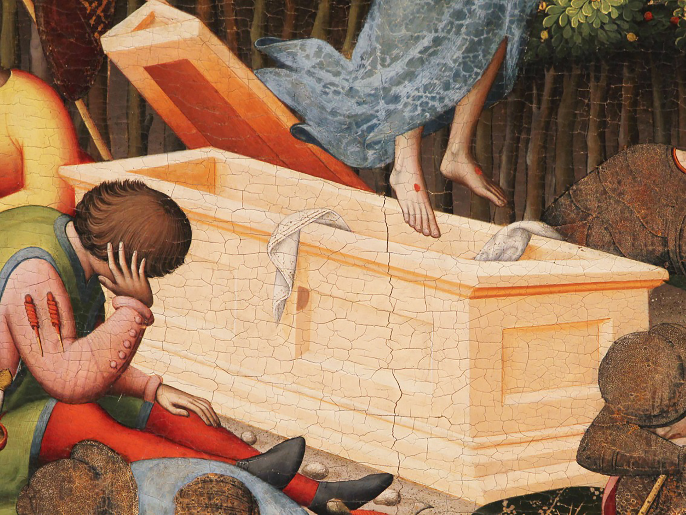 Los guardianes alrededor del sepulcro visten armaduras castellanas del siglo XV. Dos escudos cuelgan de los árboles, el de la izquierda tiene las siglas del Imperio Romano y el de la derecha tiene el dibujo de un escorpión negro, animal asociado a los judíos en la Edad Media.