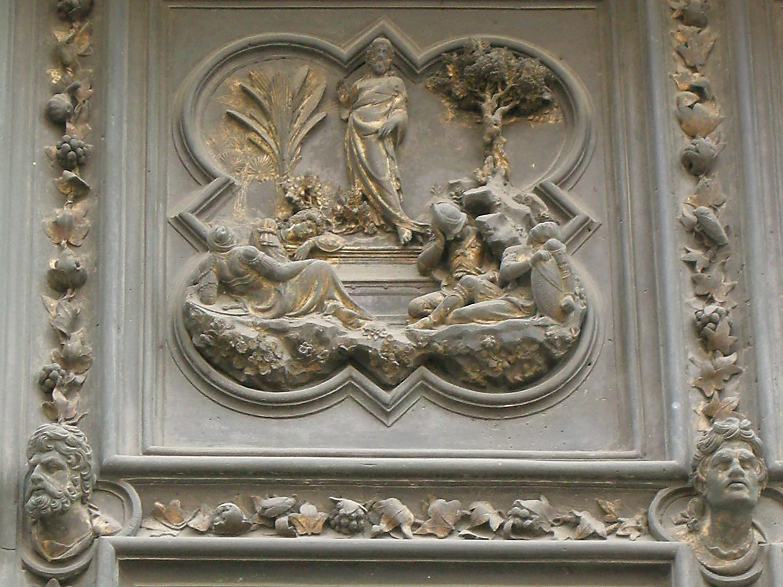 La escena se divide horizontalmente en dos espacios contrapuestos. En la parte inferior, el lugar de la muerte: el sepulcro, la sábana o sudario con el que fue envuelto el cuerpo de Jesús para el enterramiento, los guardias amenazantes con sus armas, y la tierra infecunda y pedregosa. Y en la parte superior, el lugar de la vida: el Resucitado, el bosque lleno de gran variedad de árboles frutales, las ciudades seguras en lo alto de los montes, y el fondo dorado.