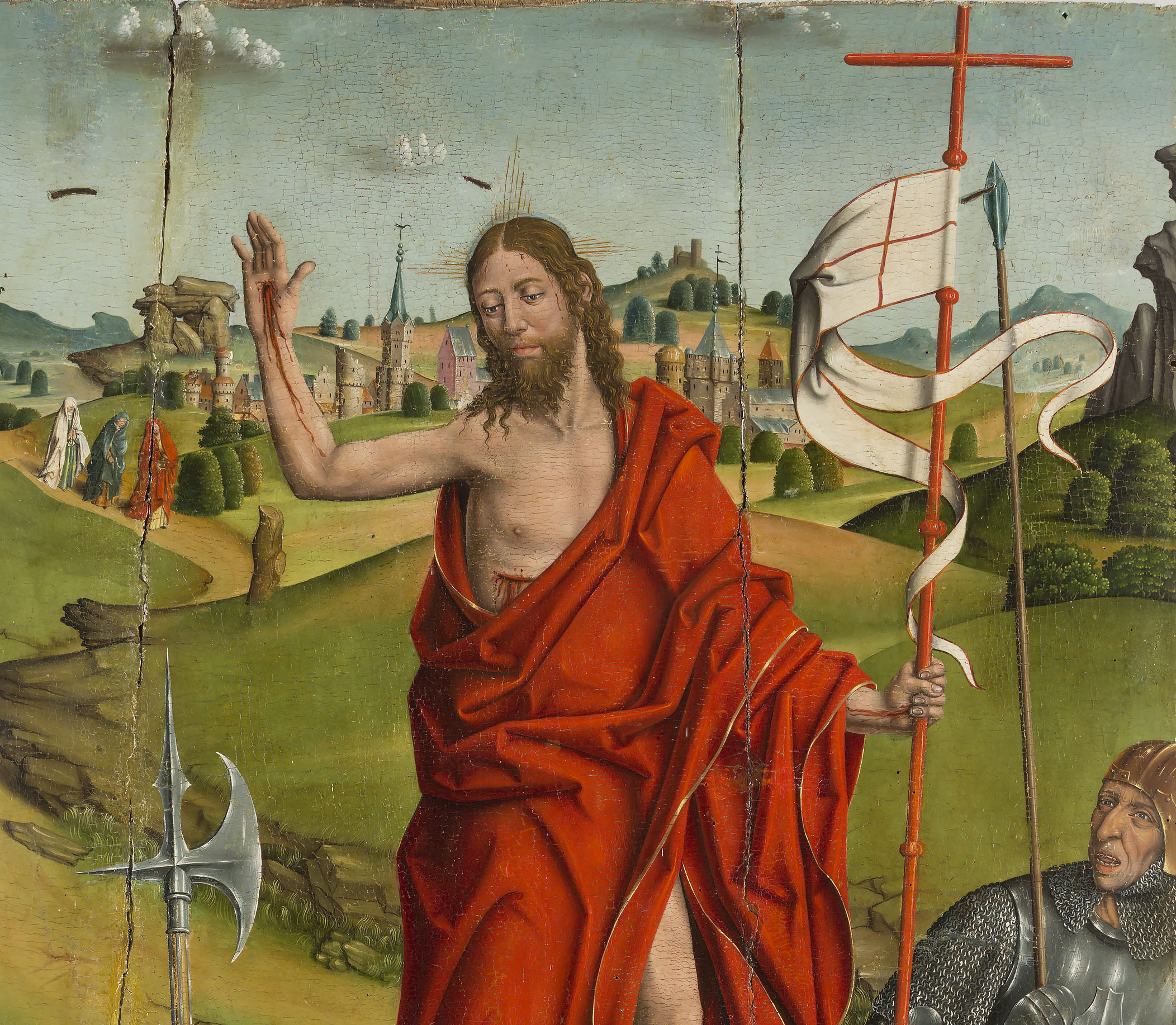Nos llama la atención el fondo donde sucede la resurrección. Un paisaje natural y arquitectónico del valle alemán de Rin, formado por colinas elevadas, ciudades con edificios de varios pisos y torres cilíndricas, de tejados muy inclinados. La tabla es una interpretación libre de la ciudad alemana de Oberwesel, lo cual demuestra la influencia de los grabados y pinturas de Martin Schongauer. Así mismo los soldados que vigilan el sepulcro están vestidos con armaduras de finales del siglo XV, de las que se aprecian todos sus detalles: cotas de malla; cascos abiertos o borgoñotas, en dorado y acerado; petos hasta la cintura; escudos; coderas; guanteles; correas y hebillas… También portan armas de la época: una alabarda y una lanza.