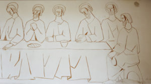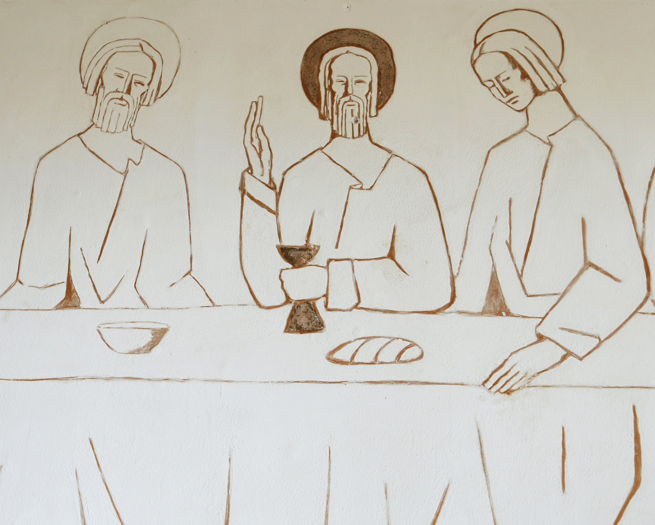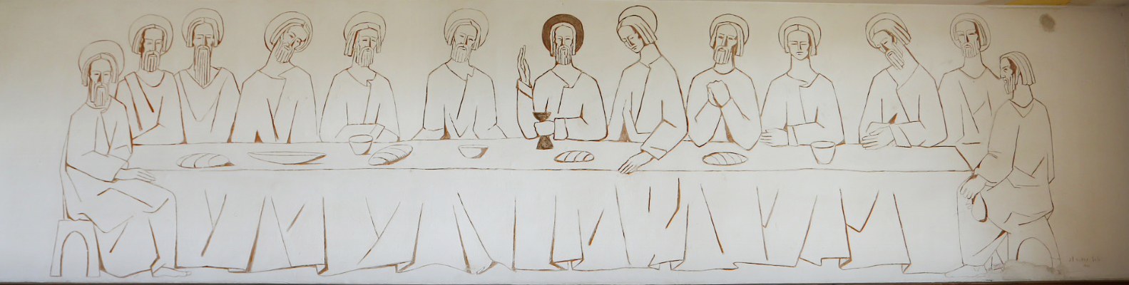 Esta larga mesa no solo está concebida para disponer a Jesús y a los apóstoles sin obstáculos, sino que está abierta intencionadamente por el frente hacia nosotros, es decir, se extiende y prolonga hasta la vida de la Iglesia peregrina en el mundo y la historia. La mesa del ágape y la mesa de la Eucaristía están unidas. Las comidas fraternas son una prolongación de la mesa de Jesús, la celebración de la Eucaristía en la capilla tiene su continuidad más inmediata en el refectorio de este colegio.
