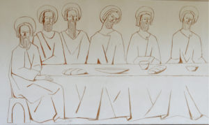 Los doce apóstoles son distribuidos simétricamente a los lados, detrás de la mesa, con el torso del cuerpo de frente pero moviendo sus cabezas hacia Jesús. Ellos recibieron aquella noche el encargo de Jesús de servir esta mesa en su Iglesia y en el mundo, realizando sus mismos gestos y palabras, para recordarle y hacerle presente: “Haced esto en memoria mía” (1 Cor 11, 24. 25). Los apóstoles de su izquierda extienden sus manos para recibir y alimentarse de los dones eucarísticos, pues son el verdadero pan que da la vida y la bebida de la salvación. Y los de su derecha esconden sus manos en las mangas de su túnica, indicando que están en adoración, aceptando y reconociendo en silencio la presencia sagrada y sacramental del mismo Cristo. Identificamos con claridad solo a dos de los doce apóstoles. A Juan, el discípulo amado, que es uno de los más jóvenes, sin barba, sentado a la izquierda de Jesús, junto a su regazo como nos dice el evangelista Juan (cf. Jn 11, 23), que al día siguiente será testigo real de lo que aquí sucede simbólicamente, cuando vio la sangre y el agua manando del costado abierto de su cuerpo en la cruz (cf. Jn 19, 34-35). Y a Judas, situado al extremo izquierdo de la mesa, sin nimbo en su cabeza, el cual esconde por debajo la bolsa de las monedas de plata con las que traicionó a Jesús. El rostro de Judas se contrapone al de los demás por su expresión tensa y fruncida, además su rostro está de perfil, no nos muestra toda su cara y se oculta, debido a su gran pecado, que se ve descubierto por Jesús: “En verdad os digo que uno de vosotros me va a entregar: uno que está comiendo conmigo” (Mc 14, 18).