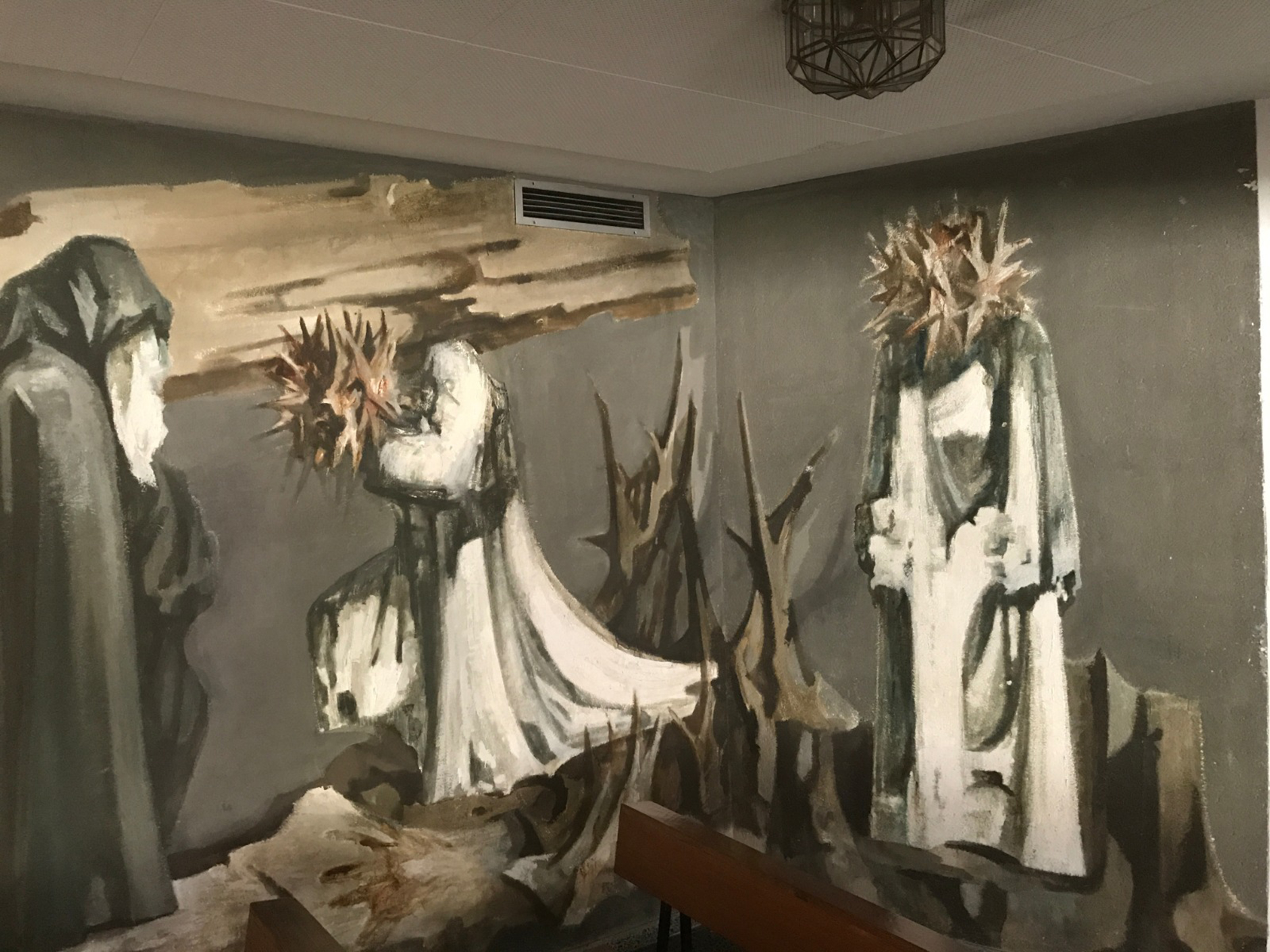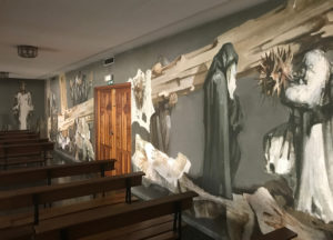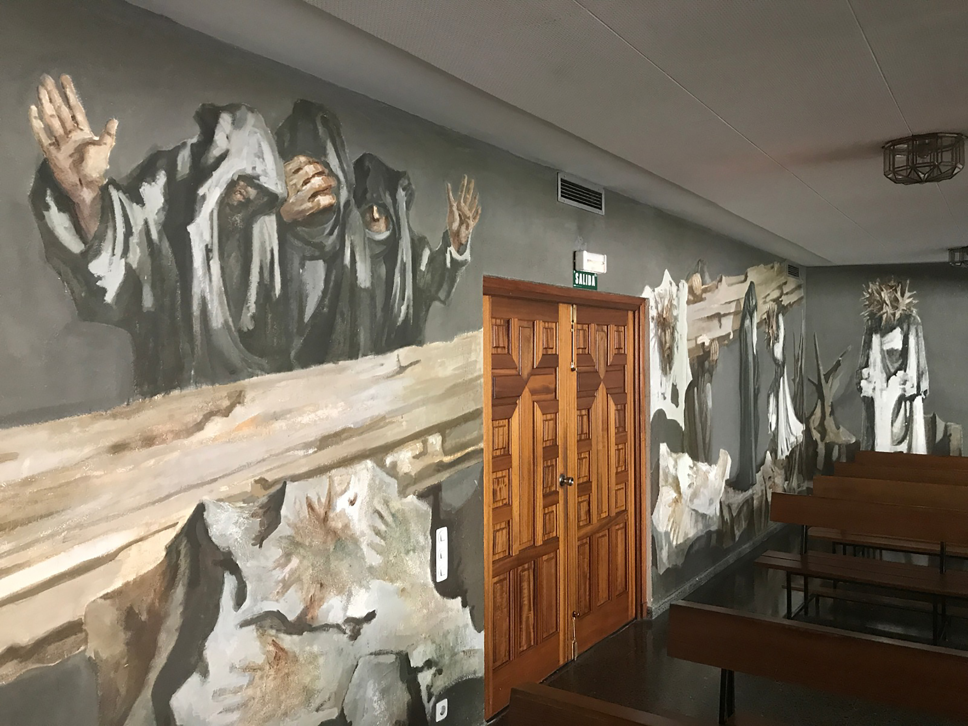 Para aproximarnos y contemplar desde la belleza el Viernes Santo nos vamos a ir al Hospital Clínico de Salamanca, lugar desgraciadamente de actualidad, por ser donde se encuentran y tratan los enfermos más graves de esta pandemia que asola al mundo. Aquí se revive, no solo ahora sino cada día, el misterio pascual del Señor en los pacientes. Si subimos al segundo piso, donde está la capilla, entraremos en lugar silencioso que cobija una de las mejores obras que pintó el artista y muralista Genaro de No. Se trata de un bellísimo, expresivo y emotivo Vía Crucis, que fue realizado en 1975, el año anterior a la inauguración de este centro hospitalario, cuya fecha está inscrita junto a su firma a los pies de las dos primeras estaciones.