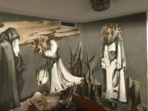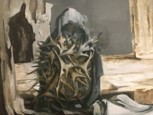 Además, ya sabemos que aparecen distintos personajes que se encuentran con Jesús en la Vía Dolorosa: María, Simón de Cirene, la Verónica o las mujeres de Jerusalén. Cada uno es tratado por Genaro de No desde la perspectiva del acompañamiento, cuidado y servicio al paciente de este hospital, pues es la presencia viva de Cristo sufriente: “porque estuve enfermo y me visitasteis” (Mt 25, 36). Dependiendo de cada situación en el camino, los personajes están dispuestos a lo largo de la cruz para identificarnos con sus gestos y actitudes. La principal es María, la madre de Jesús, porque ella es la imagen por excelencia de la compasión, acompaña a Jesús paciente comprendiendo y compartiendo su dolor. De ahí que la Virgen aparezca pintada por el artista, tanto en la tercera, la del encuentro, como en la decimotercera estación, la de Jesús muerto en sus brazos, cubierta con un manto oscuro, al modo de una cueva profunda en la que interioriza y hace suya la Pasión de Cristo. Interpela y conmueve la imagen patética de la Piedad al pie de la cruz, en la que María no se despide del cuerpo físico de su hijo sino que se queda con su dolor al recibir y acoger su punzante corona de espinas.