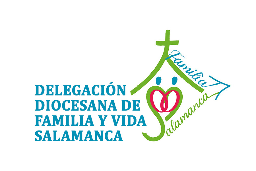 En torno a la idea de FAMILIA, ésta queda representada en la forma de una casa a través de su tejado, bajo el cual se cobijan los hogares cristianos (2Cor 7,16), IGLESIAS DOMÉSTICAS (LG 11) que se identifican por la CRUZ (1Pe 2,24) con la que se remata el logo. Casas que tienen como objetivo poder REFLEJAR EL ROSTRO DE JESÚS, (2Cor 3,18), – que se atisba por la barba que inicia la “S” de Salamanca; los ojos con las cabezas de los esposos; y el tejado como el pelo del icono-. Es el Señor quien une a los esposos, representados en el centro a través de DOS ALIANZAS ENTRECRUZADAS (Gen 2,24 y Mt 19,5-6), quienes, por su unión, formarán un nuevo hogar.