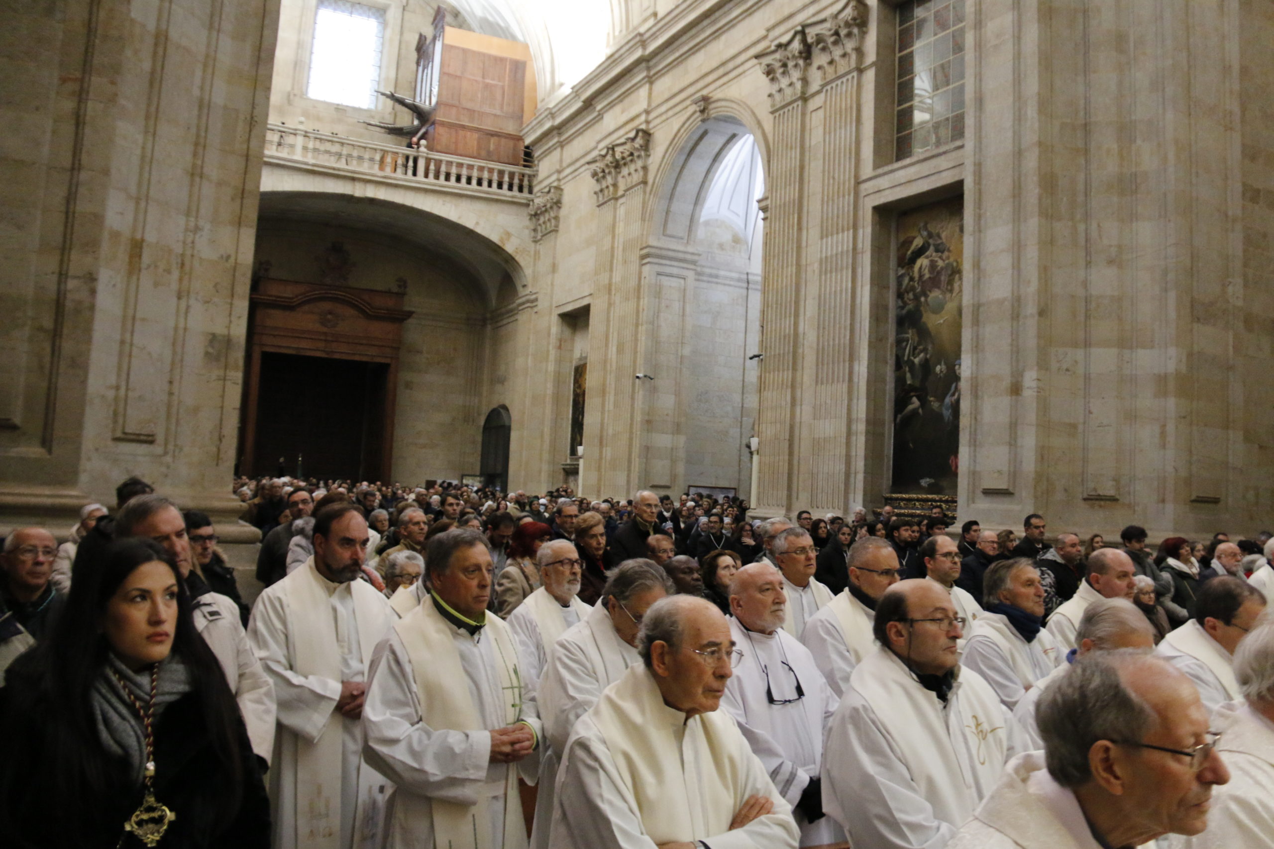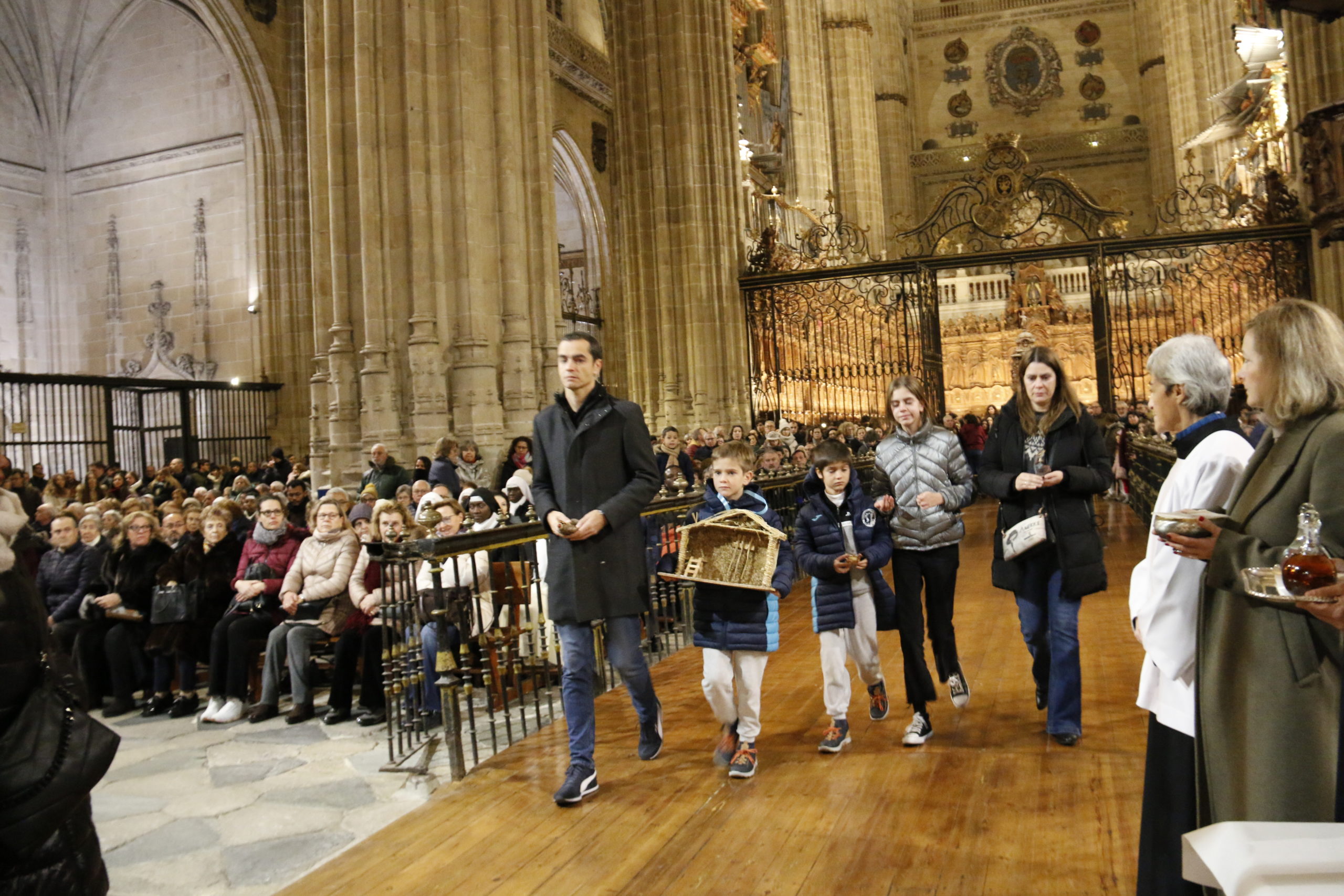 Pasadas las seis de la tarde comenzó la eucaristía, con un primer gesto de bendición y aspersión con agua bendita del obispo hacia los feligreses, en un templo lleno para la ocasión. El grupo de música diocesano, formado por cerca de un centenar de niños, jóvenes y adultos, fueron los responsables de los cantos durante toda la celebración.