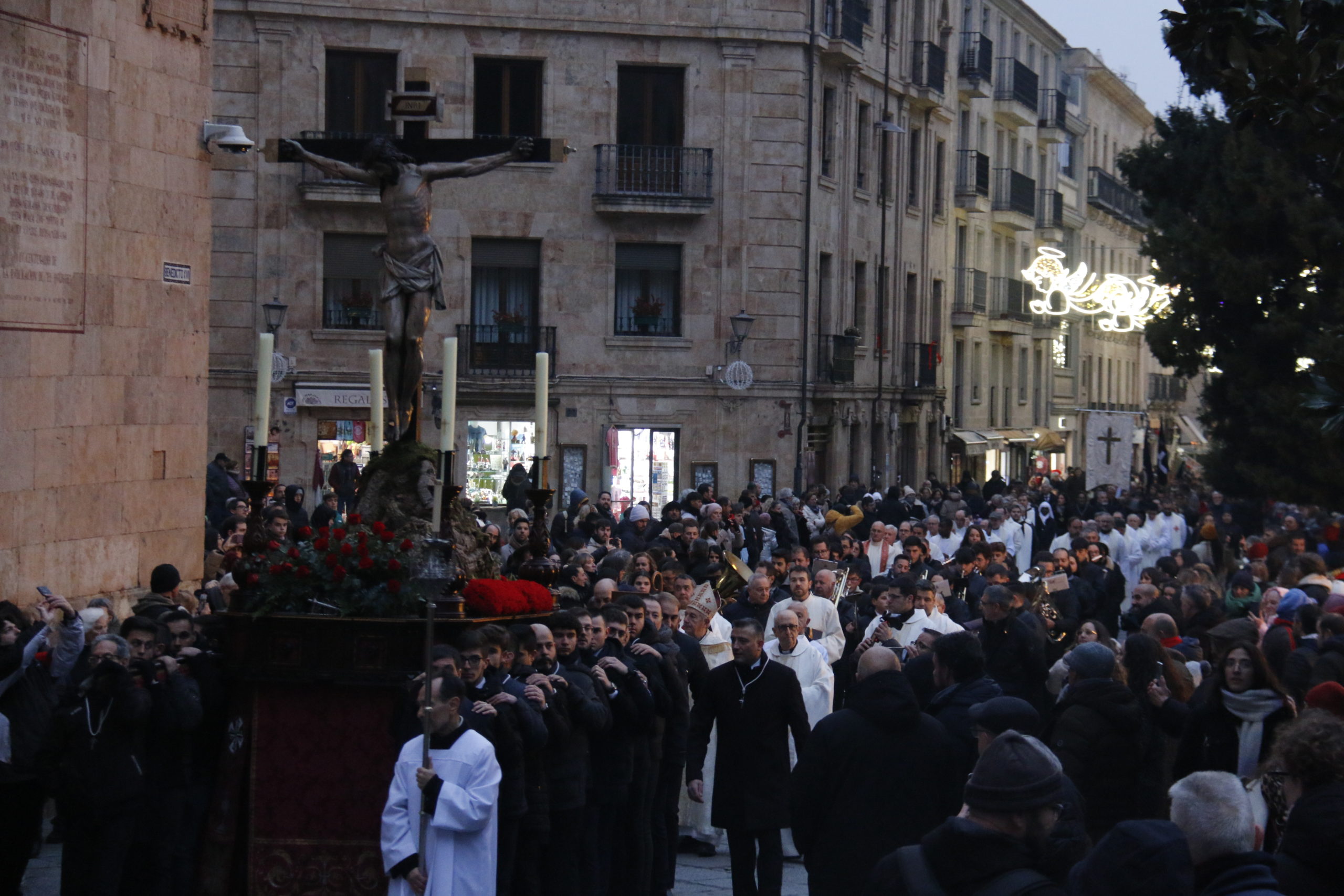 La Iglesia de Salamanca celebró este domingo, 29 de diciembre, la apertura diocesana del Jubileo ordinario de 2025 “Peregrinos de la Esperanza”, inaugurado por el papa Francisco el pasado 24 de diciembre. El rito de apertura comenzó con la denominada “collectio” (reunión) del Pueblo de Dios en la parroquia de La Purísima. En este templo se realizaron los ritos introductorios de la celebración, junto a la imagen de un Crucificado, que en esta ocasión fue el Cristo del Amor y de la Paz, que abriría la peregrinación posterior.