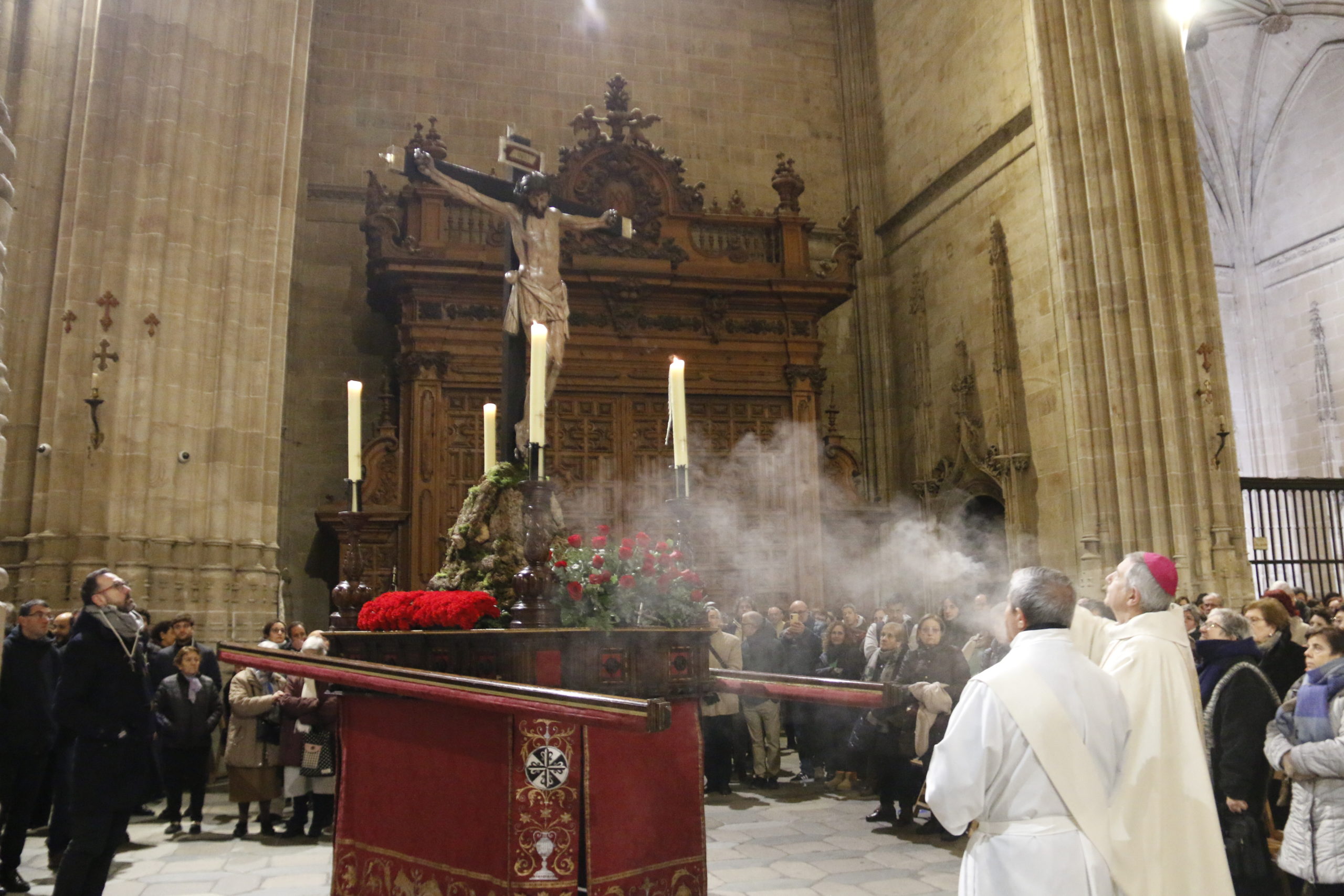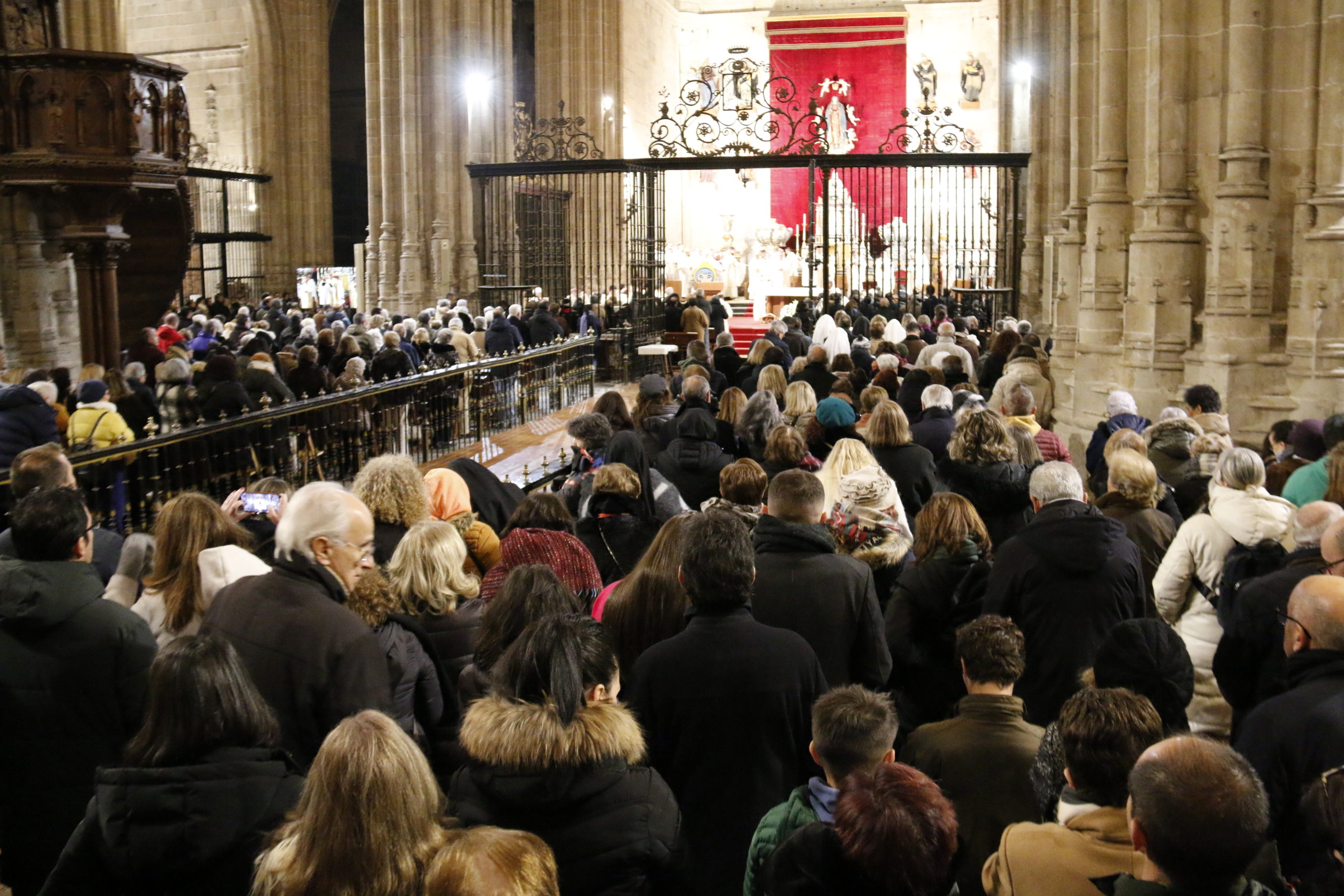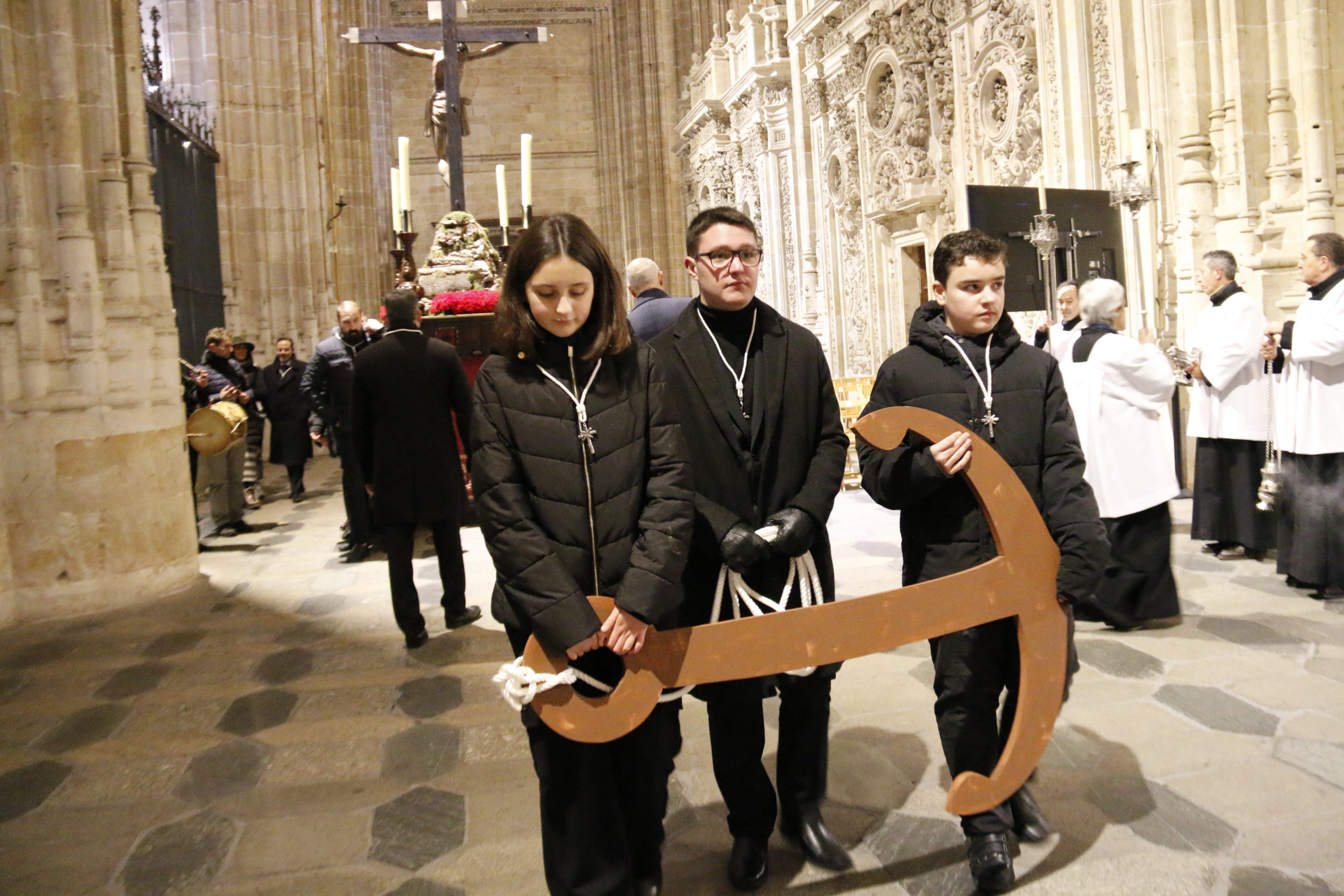 Tras recorrer las calles Compañía y Rúa Mayor, la peregrinación llegó a la puerta del obispo de la Catedral, donde Mons. José Luis Retana realizó otro símbolo de esta apertura, con una llamada al paso para levantar al Crucificado, exclamando las palabras: “Salve, cruz de Cristo, única esperanza”, a lo que el pueblo respondió cantando: “Victoria, tú reinarás, oh cruz, tu nos salvarás”.