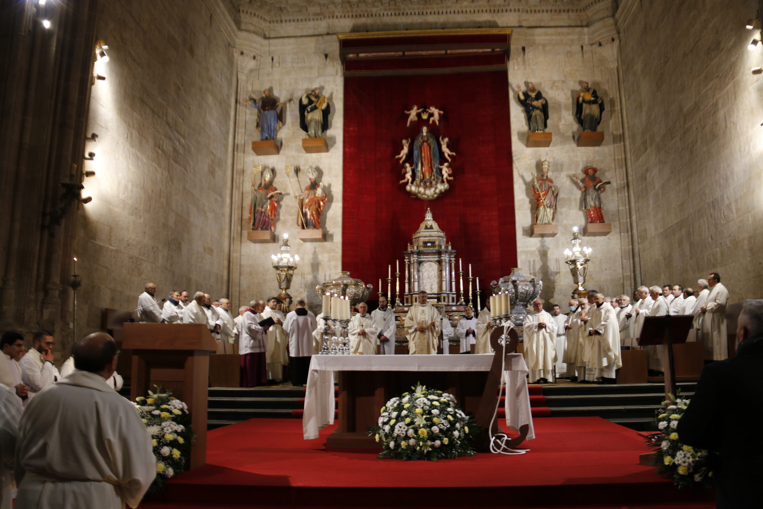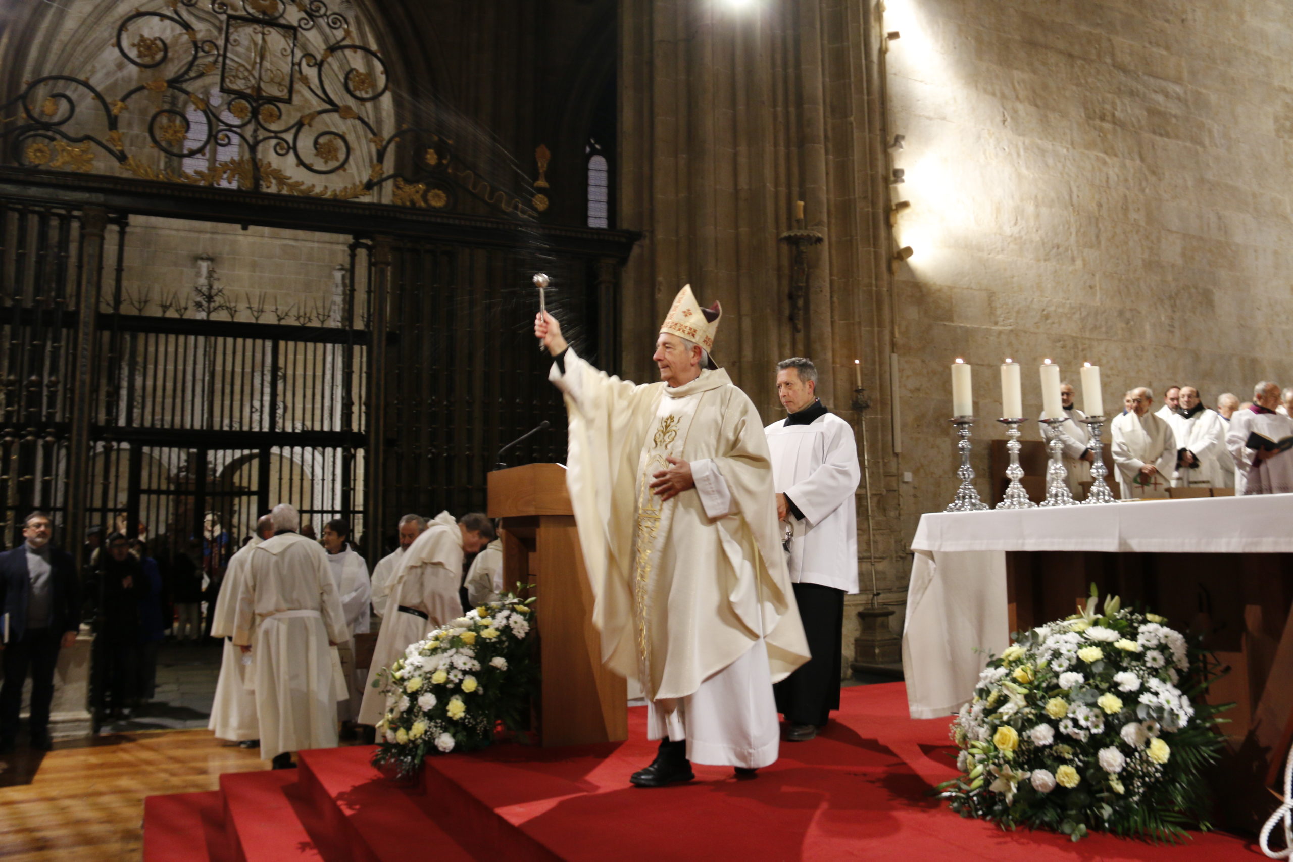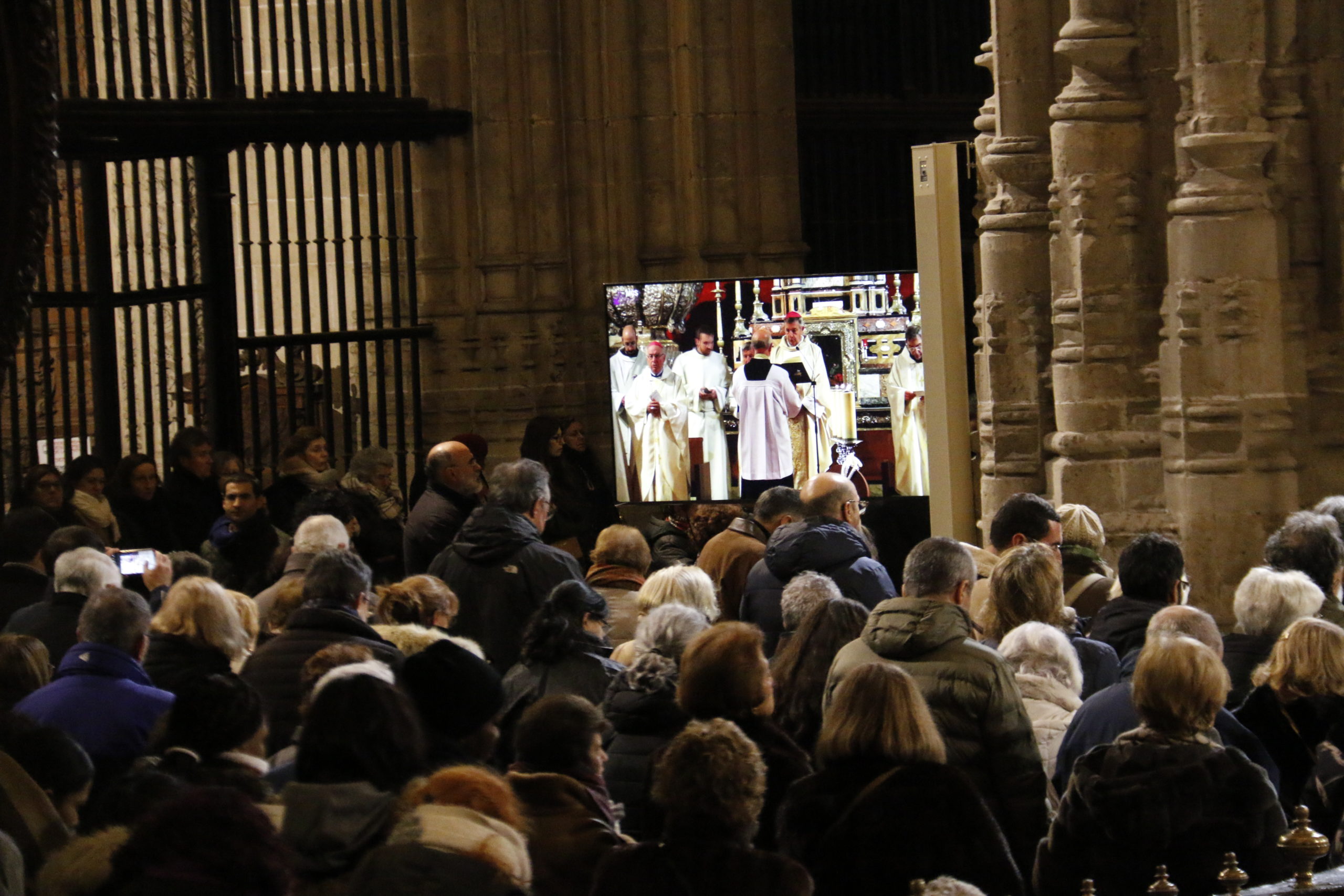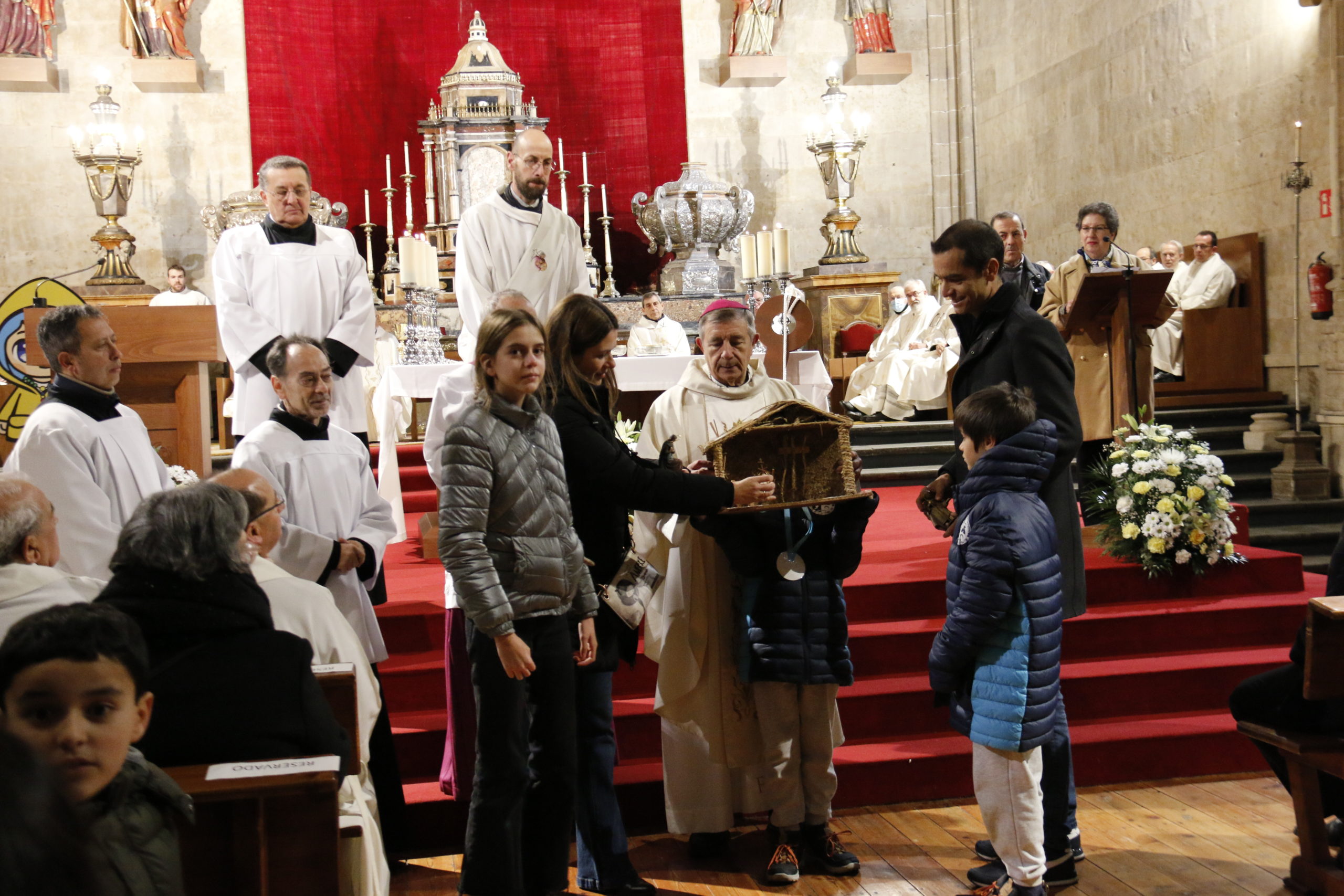 Pasadas las seis de la tarde comenzó la eucaristía, con un primer gesto de bendición y aspersión con agua bendita del obispo hacia los feligreses, en un templo lleno para la ocasión. El grupo de música diocesano, formado por cerca de un centenar de niños, jóvenes y adultos, fueron los responsables de los cantos durante toda la celebración.