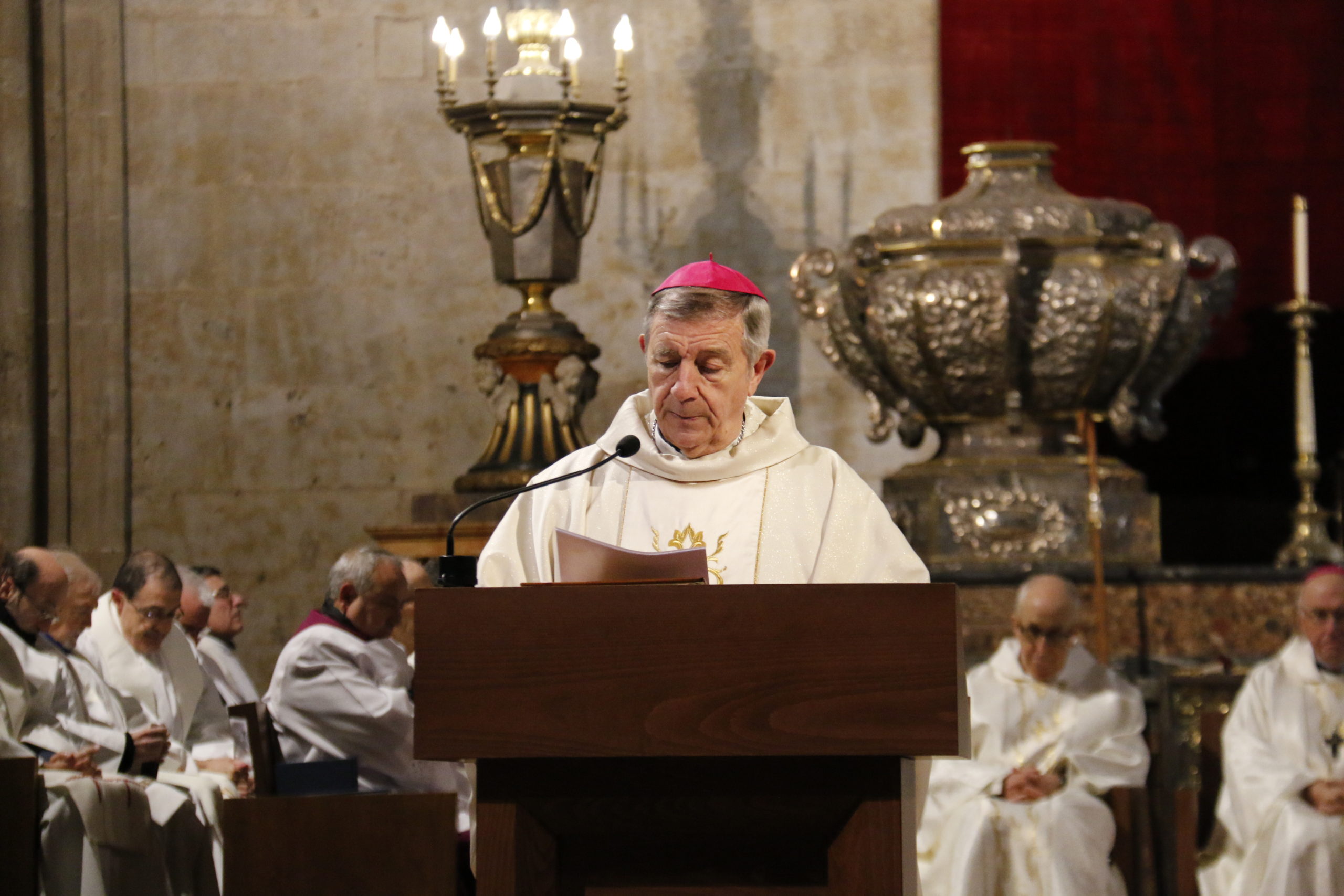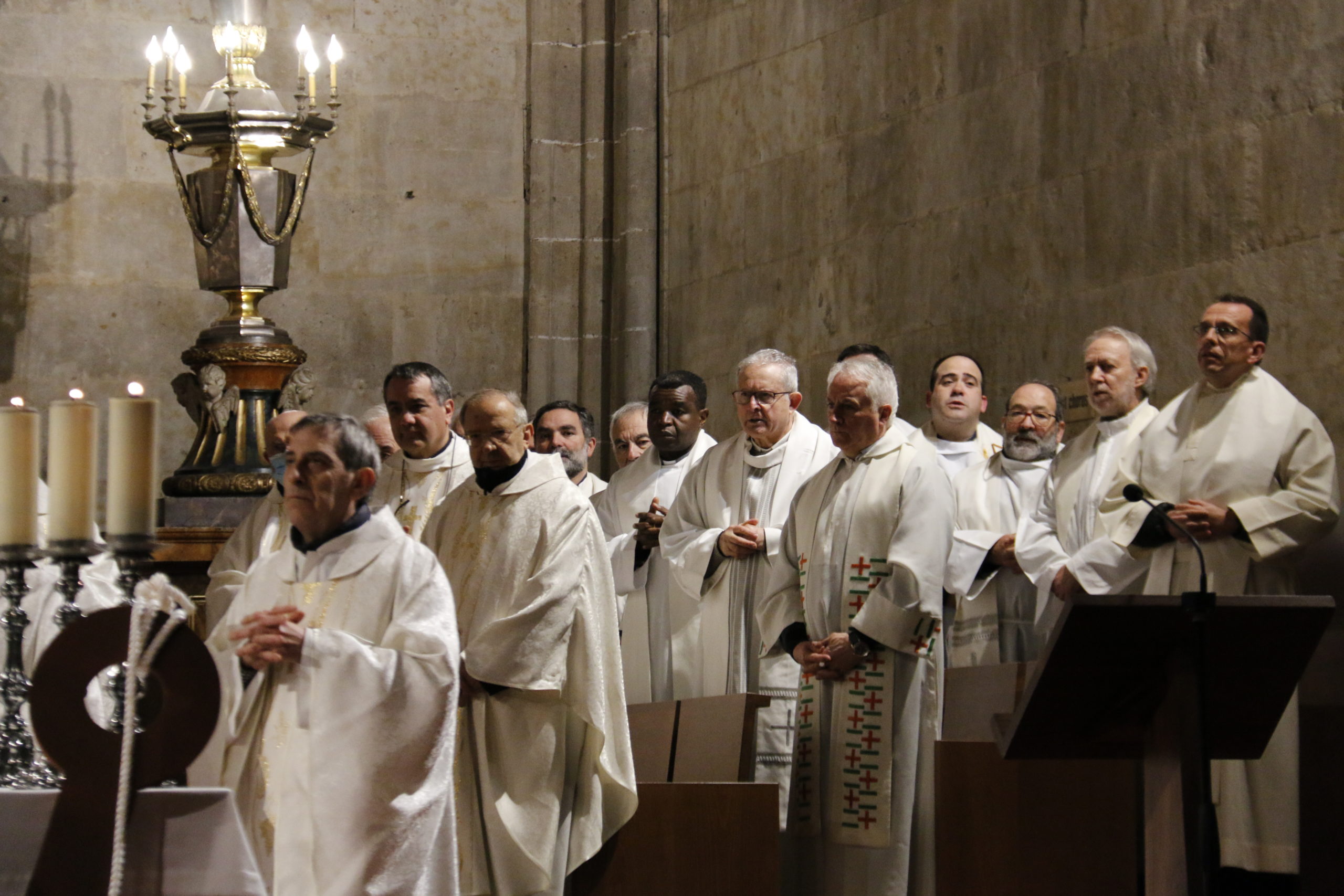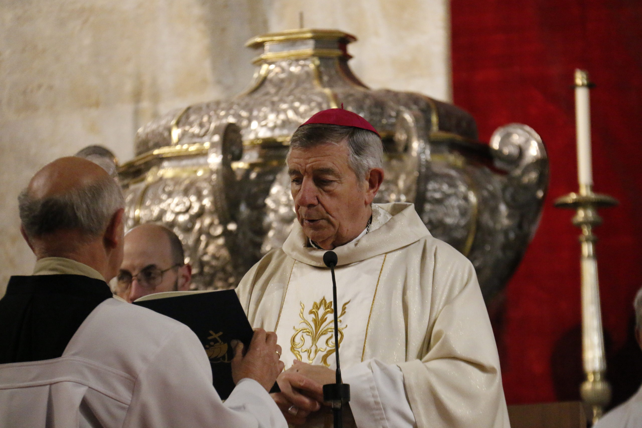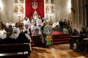 Pasadas las seis de la tarde comenzó la eucaristía, con un primer gesto de bendición y aspersión con agua bendita del obispo hacia los feligreses, en un templo lleno para la ocasión. El grupo de música diocesano, formado por cerca de un centenar de niños, jóvenes y adultos, fueron los responsables de los cantos durante toda la celebración.