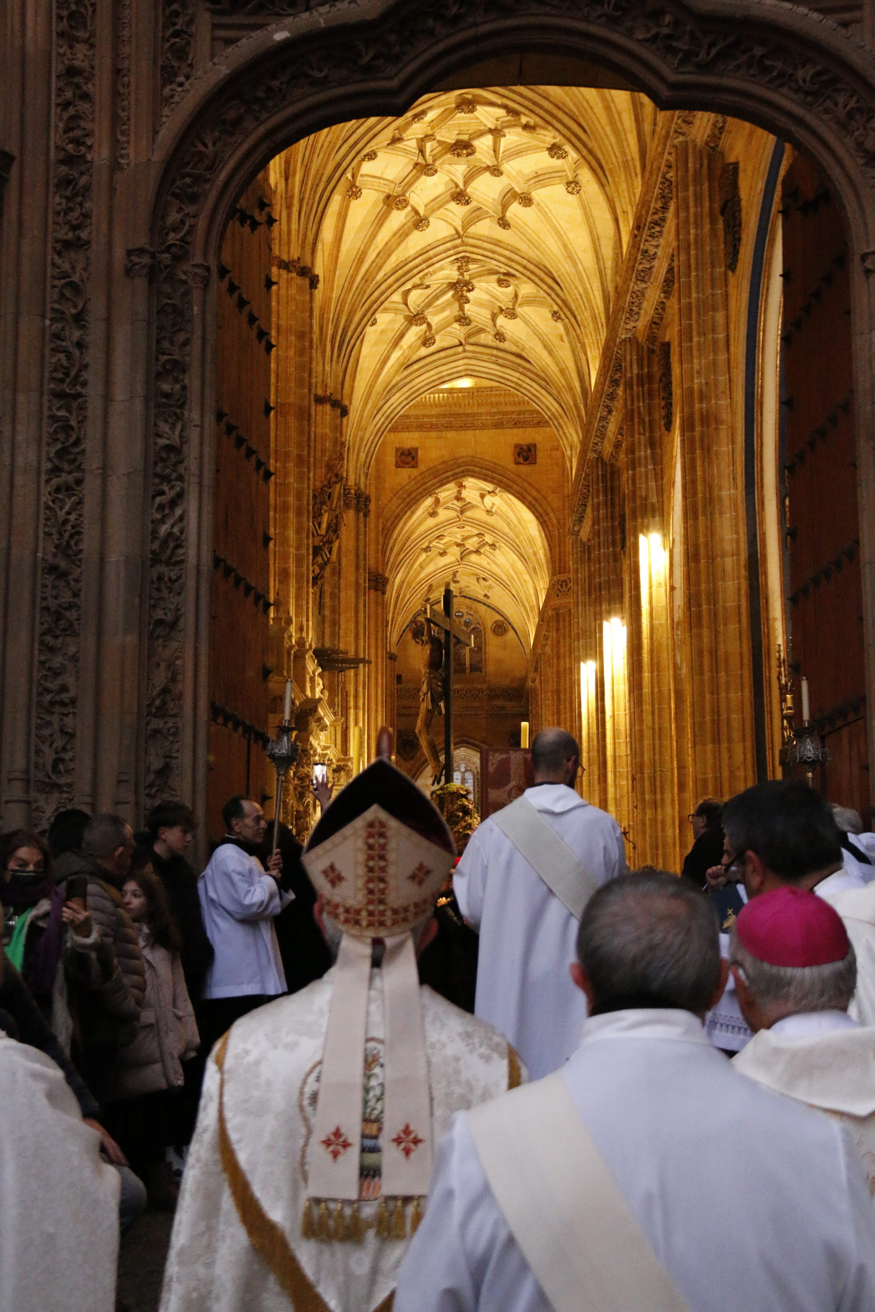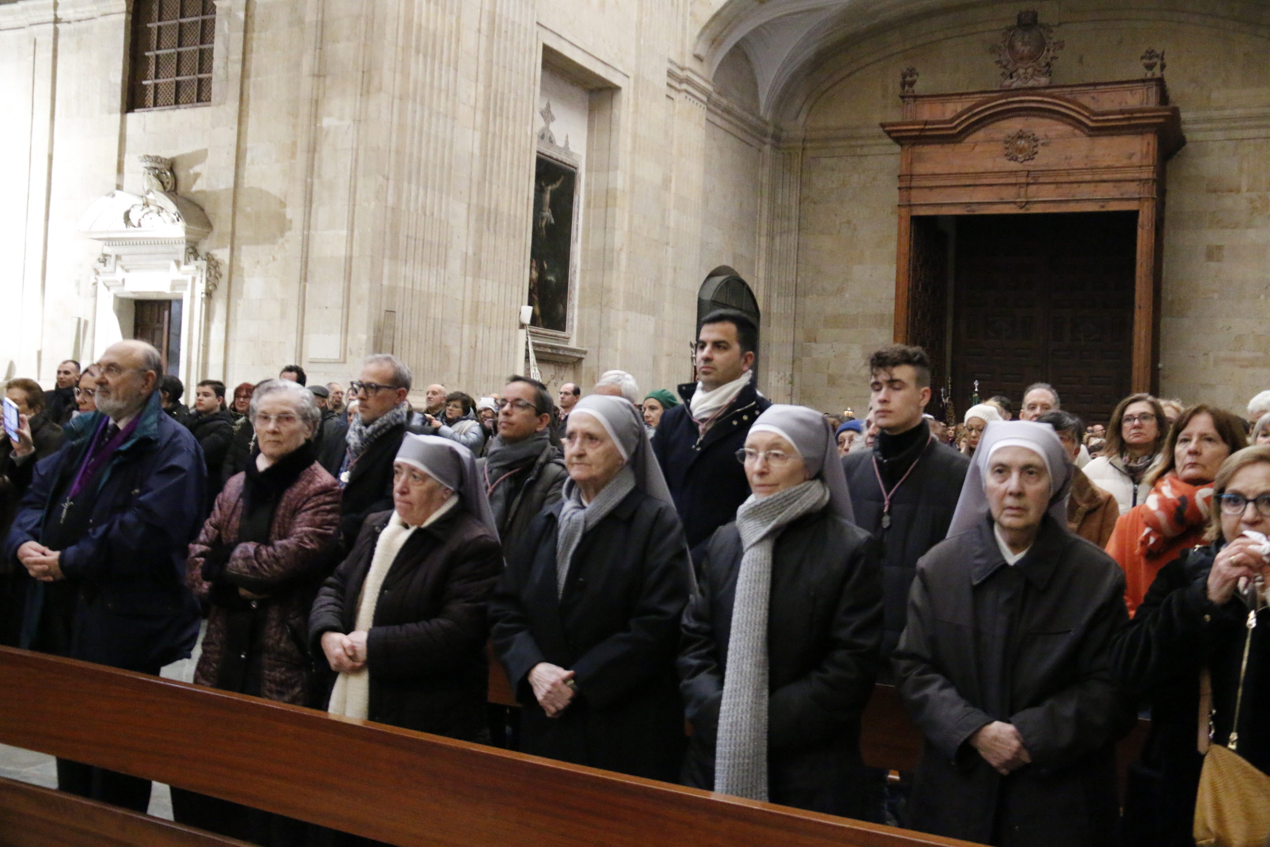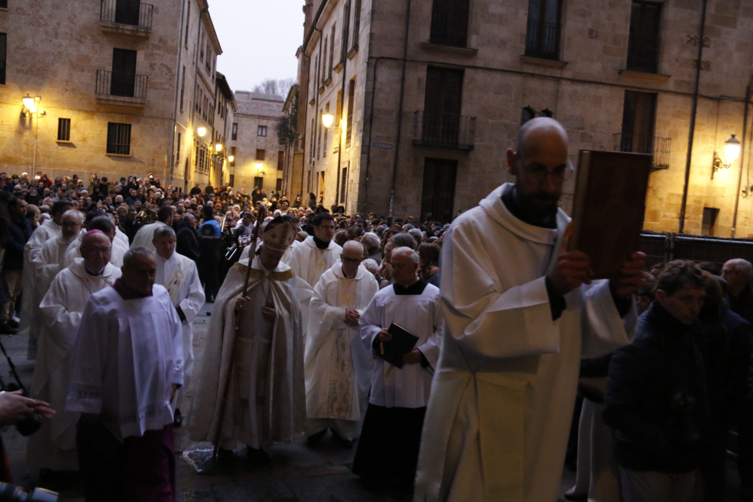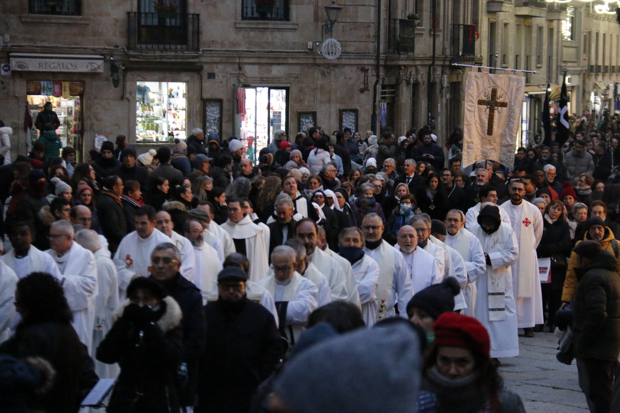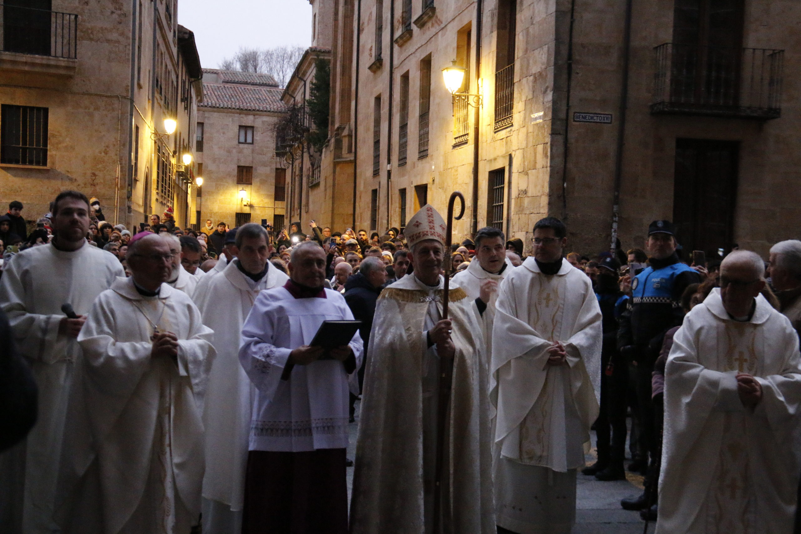 La Iglesia de Salamanca celebró este domingo, 29 de diciembre, la apertura diocesana del Jubileo ordinario de 2025 “Peregrinos de la Esperanza”, inaugurado por el papa Francisco el pasado 24 de diciembre. El rito de apertura comenzó con la denominada “collectio” (reunión) del Pueblo de Dios en la parroquia de La Purísima. En este templo se realizaron los ritos introductorios de la celebración, junto a la imagen de un Crucificado, que en esta ocasión fue el Cristo del Amor y de la Paz, que abriría la peregrinación posterior.
