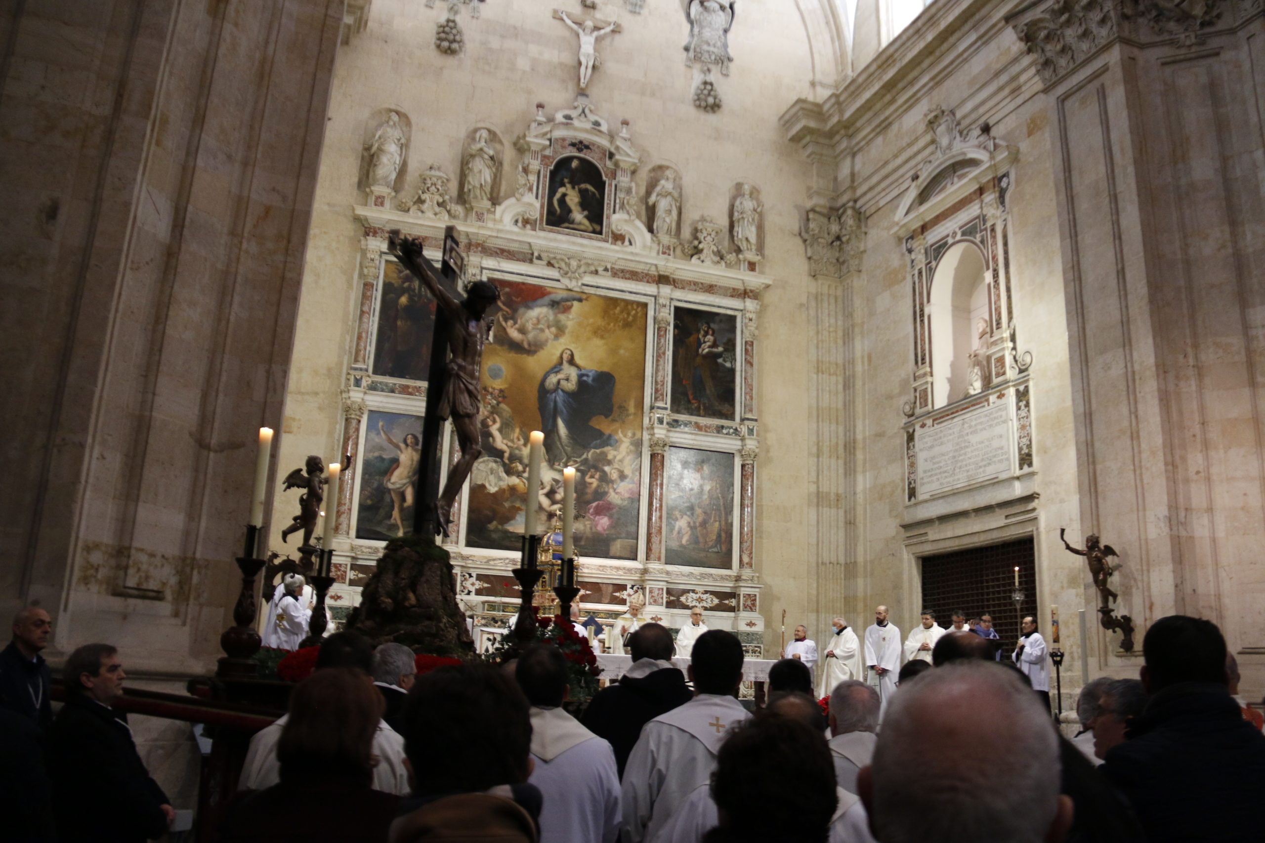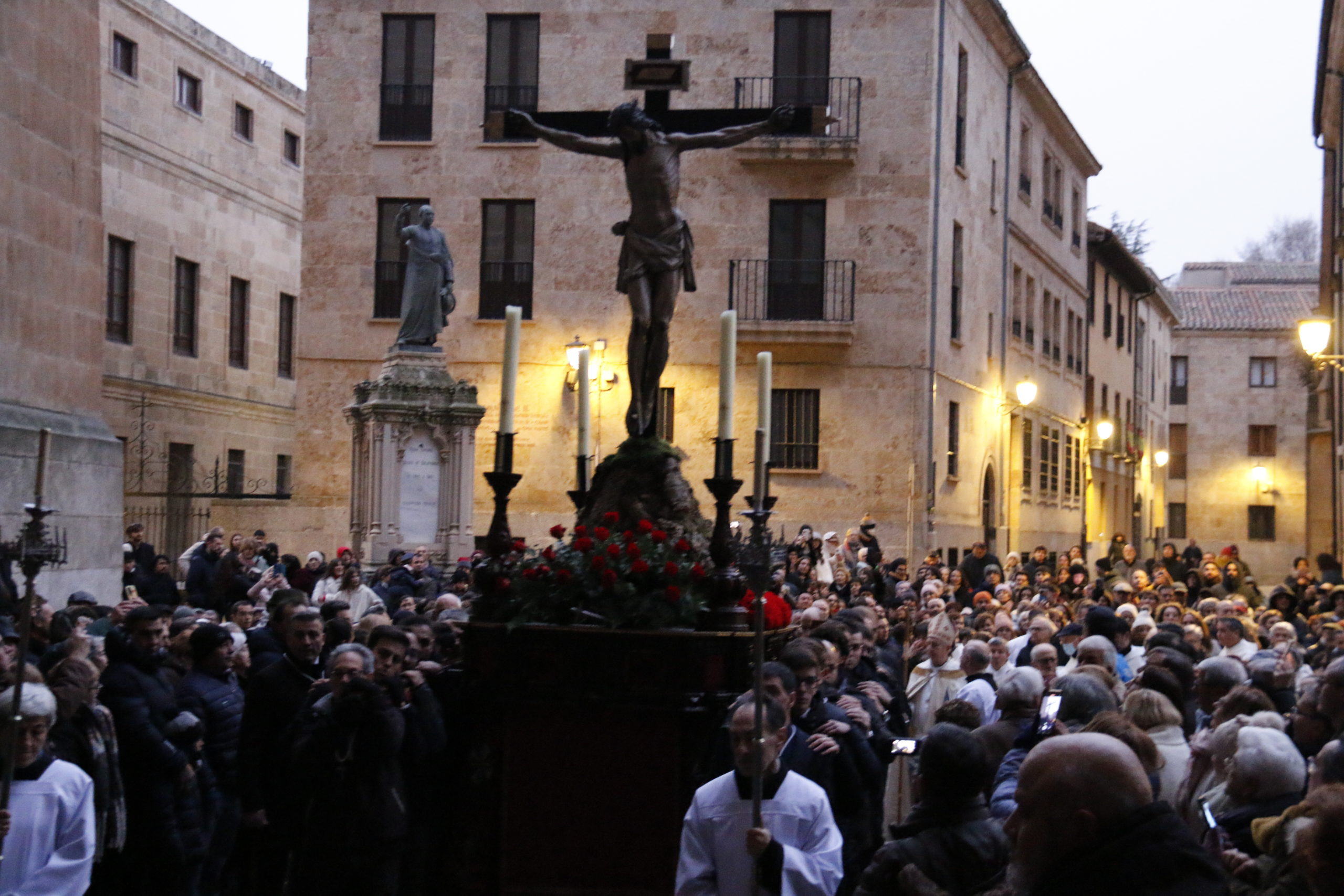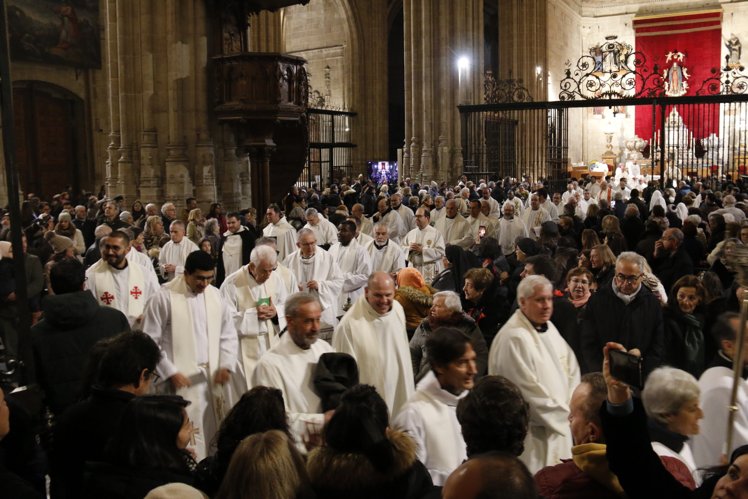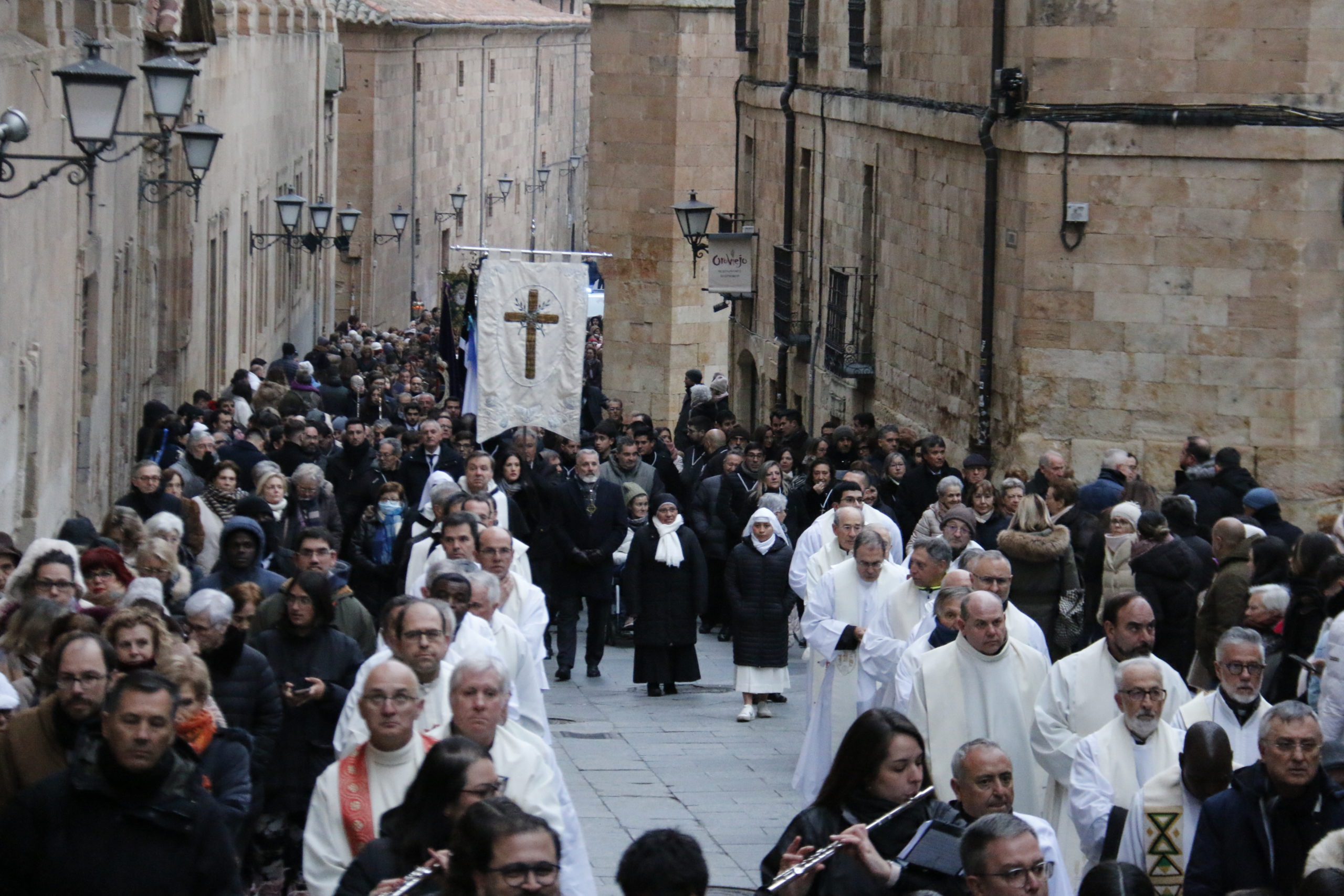 La Iglesia de Salamanca celebró este domingo, 29 de diciembre, la apertura diocesana del Jubileo ordinario de 2025 “Peregrinos de la Esperanza”, inaugurado por el papa Francisco el pasado 24 de diciembre. El rito de apertura comenzó con la denominada “collectio” (reunión) del Pueblo de Dios en la parroquia de La Purísima. En este templo se realizaron los ritos introductorios de la celebración, junto a la imagen de un Crucificado, que en esta ocasión fue el Cristo del Amor y de la Paz, que abriría la peregrinación posterior.