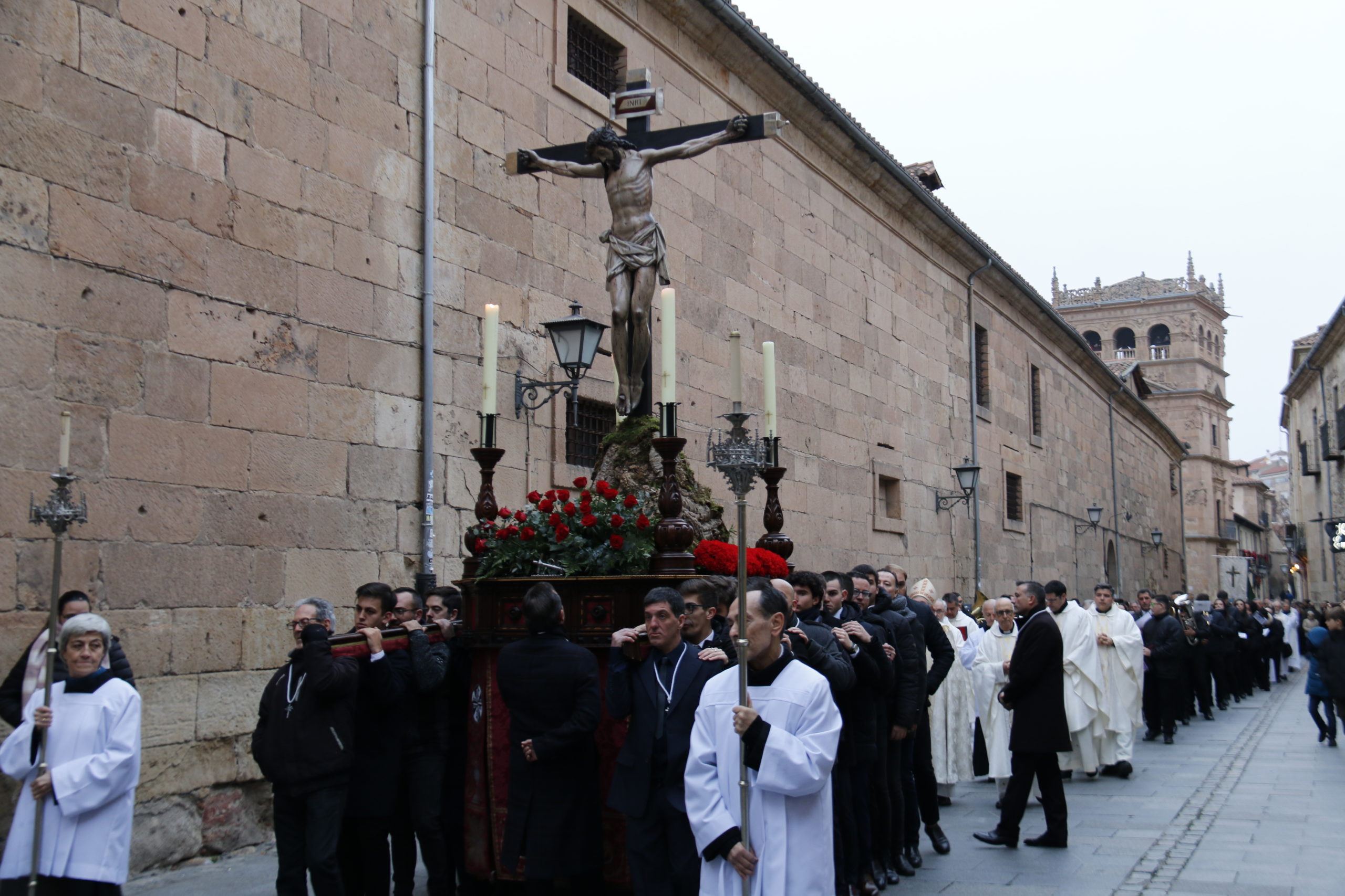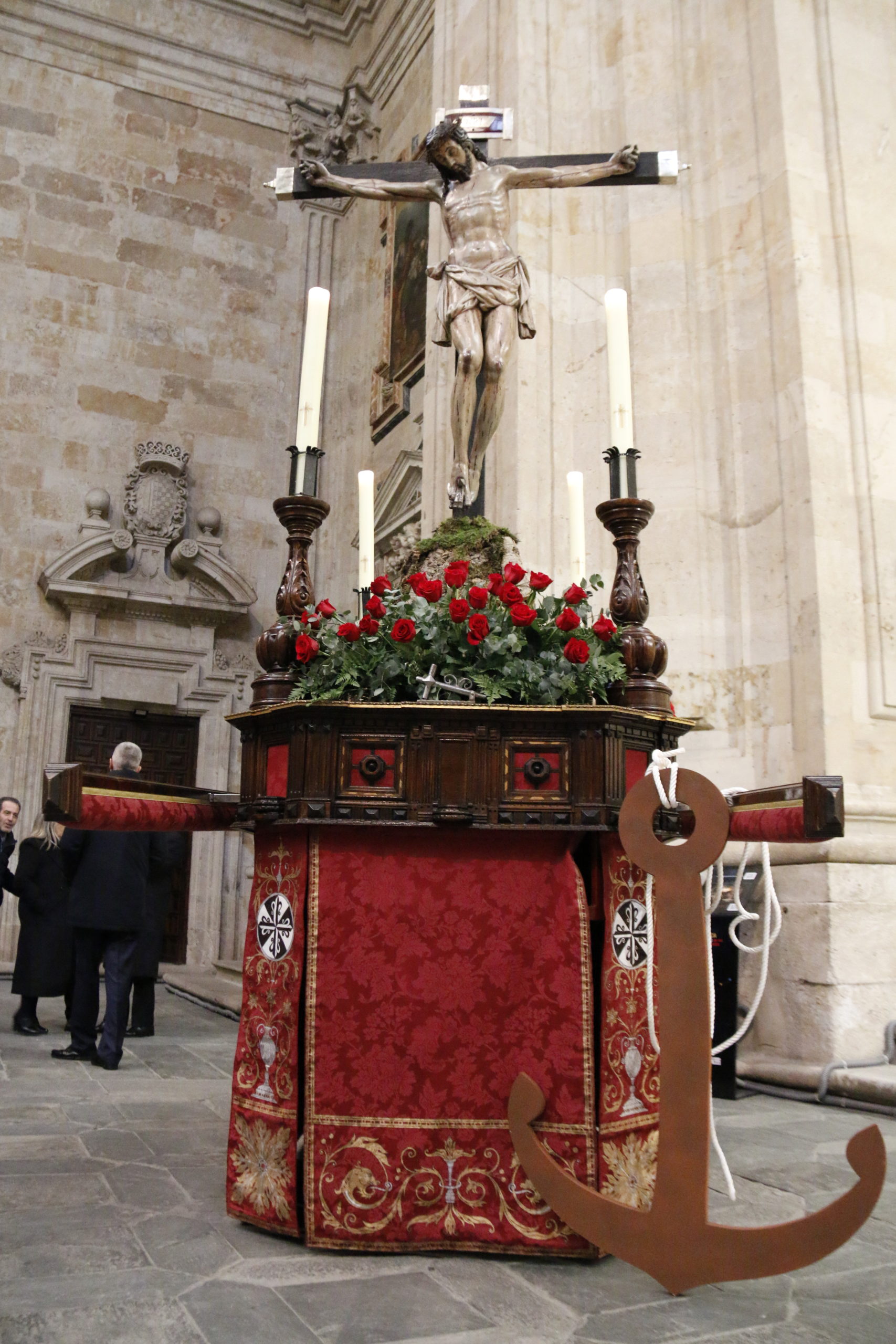Al finalizar, comenzó la peregrinación hacia la Catedral con el Cristo del Amor y de la Paz abriendo el cortejo, “como signo del camino de esperanza del pueblo peregrino tras la cruz de Cristo”. Detrás del paso, caminaba el obispo y los sacerdotes, con el acompañamiento musical de la Banda de música de Alba de Tormes. El ancla, como símbolo del Jubileo, también era portado por tres jóvenes cofrades, y junto a ellos, representantes de las cofradías de la diócesis y el Pueblo de Dios.