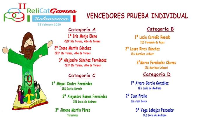 En esta primera fase del concurso, de carácter individual, participaron 344 alumnos (de 5º y 6º de Educación Primaria, ESO y Bachilerato) de 22 centros educativos salmantinos (públicos y concertados), quienes divididos en cuatro categorías según su nivel, se sometieron a un test sobre la asignatura de Religión. Los vencedores de esta prueba individual han sido: